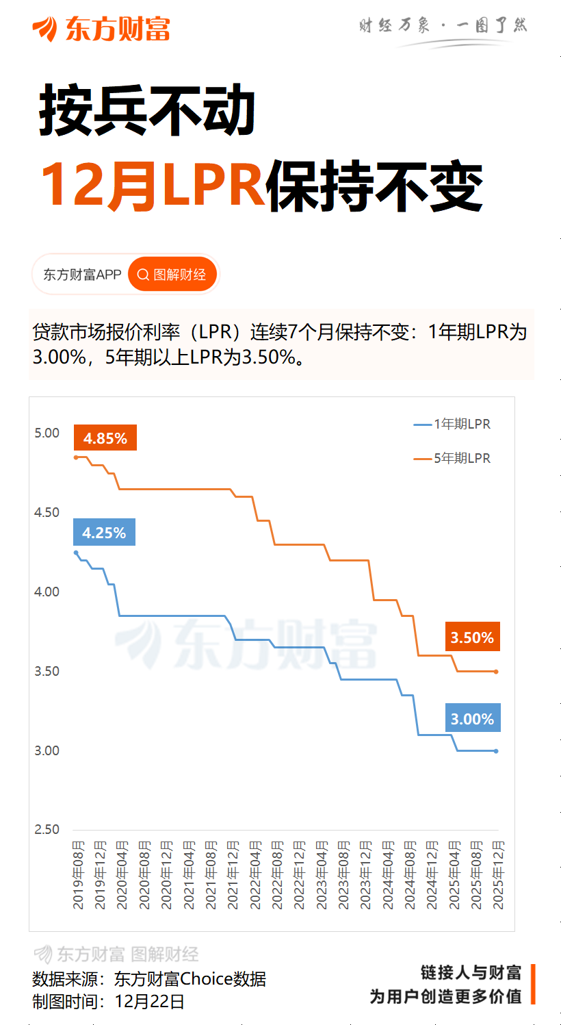 2025年最后一次贷款市场报价利率(LPR)出炉,LPR连续7个月保持不变。 中国人民银行授权全国银行间同业拆借中心公布,2025年12月22日,贷款市场报价利率(LPR)为:1年期LPR为3.00%,5年期以上LPR为3.50%,均较上月保持不变,以上LPR在下一次发布LPR之前有效。 作为主要政策利率的7天期逆回购利率自5月下调后一直按兵不动,因此,LPR报价的定价基础本月未发生改变。 LPR今年唯一一次调整是在5月,1年期和5年期以上LPR均下调10个基点。贷款利率则保持在历史低位水平。央行数据显示,11月份企业新发放贷款(本外币)加权平均利率约为3.1%,比上年同期低约30个基点;个人住房新发放贷款(本外币)加权平均利率约为3.1%,比上年同期低约3个基点。 日前举行的中央经济工作会议指出,要继续实施适度宽松的货币政策。把促进经济稳定增长、物价合理回升作为货币政策的重要考量,灵活高效运用降准降息等多种政策工具,保持流动性充裕,畅通货币政策传导机制,引导金融机构加力支持扩大内需、科技创新、中小微企业等重点领域。保持人民币汇率在合理均衡水平上的基本稳定。 贷款市场报价利率(LPR)由各报价行按公开市场操作利率(公开市场7天期逆回购利率)加点形成的方式报价,由全国银行间同业拆借中心计算得出,为银行贷款提供定价参考。目前,LPR包括1年期和5年期以上两个品种。