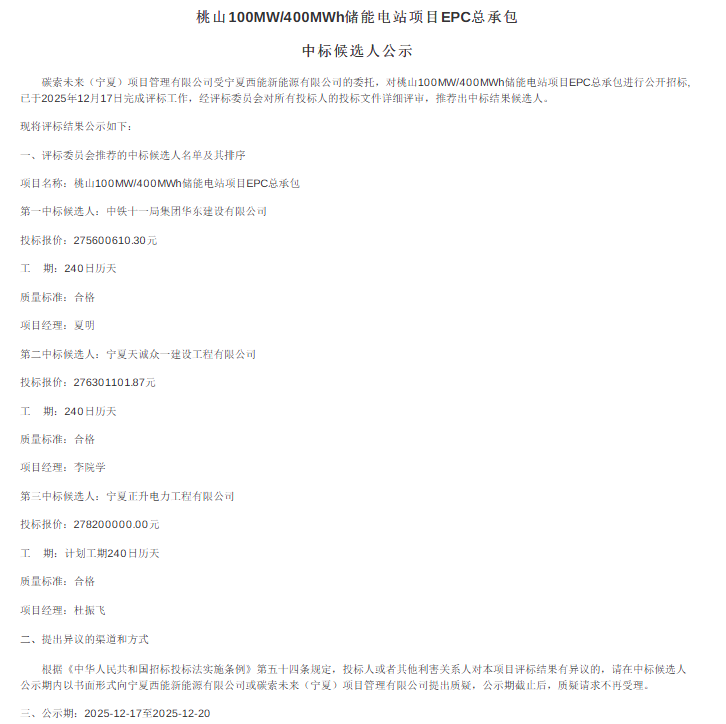 北极星储能网获悉,12月17日,桃山100MW/400MWh储能电站项目EPC总承包中标候选人公示。 据公示,第一中标候选人为中铁十一局集团华东建设有限公司,投标报价为275600610.3元,折合单价0.689元/Wh; 第二中标候选人为宁夏天诚众一建设工程有限公司,投标报价为276301101.87元,折合单价0.6908元/Wh; 第三中标候选人为宁夏正升电力工程有限公司,投标报价为278200000元,折合单价0.6955元/Wh。