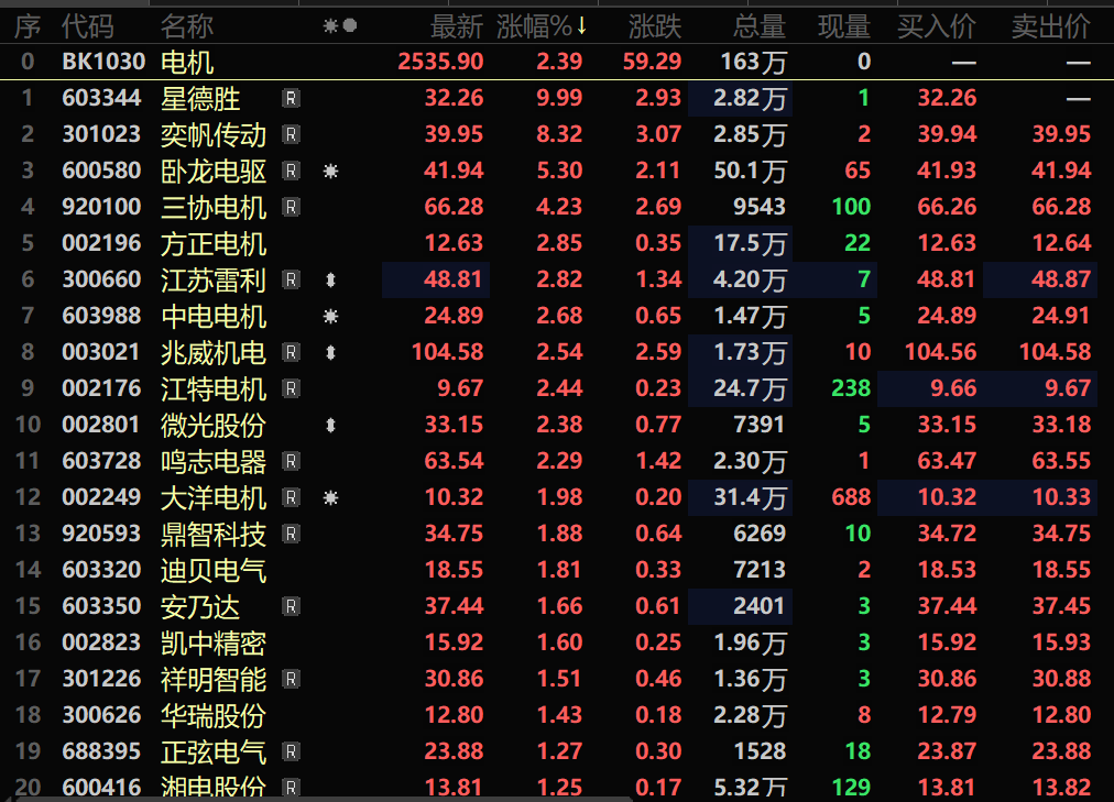 SMM12月22日讯: 中央经济工作会议锚定新质生产力发展主线,人形机器人、新能源汽车、高效发电作为新质生产力的重要环节,其产业规模化进程的加速,将直接拉动伺服电机、驱动电机、高效工业电机等核心部件的市场需求。与此同时,人形机器人政策支持加码,国产替代与规模化量产提速,作为机器人动力核心的伺服电机,有望受益。中汽协表示,11月,汽车产销延续良好表现,展望全年,汽车内需市场在政策组合效应推动下有效改善,新动能加快释放,对外贸易呈现出较好韧性,汽车产销量全年有望再创历史新高。值得关注的是,多家电机龙头企业近期密集披露在人形机器人、低空经济动力电机等新兴领域的技术突破与订单进展,叠加部分市场资金对电机板块的青睐,带动电机板块走强。截至12月22日10:02分,电机行业涨2.39,个股方面:星德胜涨停,奕帆传动、卧龙电驱、三协电机、方正电机、江苏雷利以及中电电机等涨幅居前。