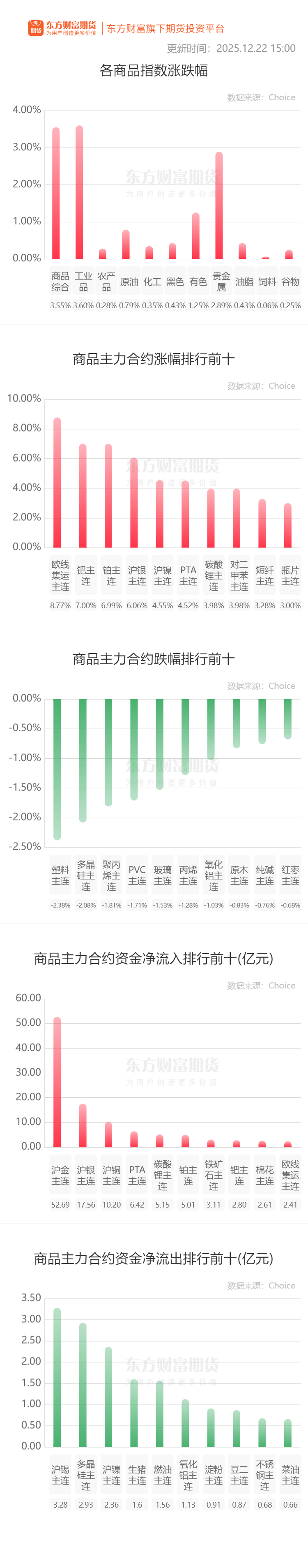 行情纵览![]() 宏观产经央行:央行发布关于实施一次性信用修复政策有关安排的通知。通知提到,对于2020年1月1日至2025年12月31日期间,单笔金额不超过10000元人民币的个人逾期信息,个人于2026年3月31日(含)前足额偿还逾期债务的,金融信用信息基础数据库将不予展示。 新华财经:野村全球宏观研究团队预计,人工智能驱动的投资热潮以及更具支持性的货币与财政政策将在2026年持续推动全球经济强劲增长。野村表示,预计在美国全新更偏鸽派的领导层管理下,美联储将在2026年6月和9月各降息一次。 品种资讯黑色系期货 铁矿石:2025年12月15日-12月21日中国47港到港总量2790.2万吨,环比减少137.9万吨;中国45港到港总量2646.7万吨,环比减少76.7万吨;北方六港到港总量1256.4万吨,环比减少102.1万吨。(我的钢铁网) 焦煤:炼焦煤市场显现典型淡季特征,整体价格承压运行,但部分品种受突发因素扰动,出现显著结构性溢价,上周炼焦煤线上竞拍流拍率减少,总计挂牌数量187.44万吨,成交数量154.45万吨,流拍占比17.6%,环比下降4.8个百分点,而受制于淡季因素,市场情绪维持谨慎,竞拍价格跌多涨少。(我的钢铁网) 农产品期货 生猪:据农业农村部监测,截至12月22日14:00时,全国农产品批发市场猪肉平均价格为17.56元/公斤,较上周五上升0.2%;鸡蛋平均价格为7.48元/公斤,较上周五上升0.4%。(新华财经) 棕榈油:据马来西亚独立检验机构AmSpec,马来西亚12月1-20日棕榈油出口量为821442吨,较上月同期出口的828680吨减少0.87%。(新华财经) 有色/贵金属期货 沪金:今日国内黄金饰品价格对比显示,黄金珠宝品牌公布的境内足金首饰价格多数报1368元/克,较上周上涨15元/克(上周多数品牌足金饰品价格一直持稳于1353元/克)。(财联社) 沪银:中信建投研报称,2025年12月看好家电、电力及公用事业、国防军工、电子、计算机和保险的相对收益。黄金、白银、铜和原油的VIX抬升,中长期依然看多黄金。白银的VIX处于历史极大值,警惕超买后的回调风险。(人民财讯) 沪铜:铜市场由贸易动荡、供应紧张和对长期需求的乐观预期主导的这一年进入尾声,价格再度刷新纪录,逼近每吨12,000美元。伦敦金属交易所(LME)距离2025年底仅剩几个交易日,铜价正迈向自2009年以来最大的年度涨幅。(财联社) 氧化铝:据Mysteel调研了解,新疆地区氧化铝招标采购价格为2940-2950元/吨(到厂价),北方地区货源。(我的钢铁网) 能化期货 橡胶:截至2025年12月21日,青岛地区天胶保税和一般贸易合计库存量51.52万吨,环比上期增加1.63万吨,增幅3.28%。保税区库存7.96万吨,增幅2.72%;一般贸易库存43.56万吨,增幅3.38%。(隆众资讯) 纯碱:截止到2025年12月22日,本周国内纯碱厂家总库存150.04万吨,较上周四涨0.11万吨,涨幅0.07%。其中,轻质纯碱72.92万吨,环比增加0.16万吨,重质纯碱77.12万吨,环比下降0.05万吨。(隆众资讯) 烧碱:今日,山东液碱局部价格稳定,个别企业因自身出货情况价格小幅调整。鲁西南32%离子膜碱主流成交690-720;鲁中东部32%离子膜碱主流成交695-750,50%离子膜碱主流成交1110-1200;鲁北32%离子膜碱主流成交720-770;鲁南32%离子膜碱主流成交720-730。(单位:元/吨)(隆众资讯) 晚间关注21:30 美国:GDP价格指数:季调 (文章来源:东方财富研究中心) |