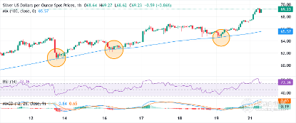 (华通国标一号银日K线图) 技术分析上看,在过去两周左右从100小时简单移动平均线(SMA)反复反弹的背景下,上周突破66.40-66.50美元的水平阻力位被视为白银多头的关键触发因素。随后的强势突破了上周五的67.20-67.25美元区域,证实了近期的积极前景。金价目前在69.25美元附近交易,当日上涨3%。 与此同时,白银小时图上的相对强弱指数(RSI)位于70关口上方,表明情况可能会有所延长。100小时移动均线攀升至65.57美元,价格保持在其上方,保持近期趋势偏向上行。此外,趋同背离移动平均线(MACD)位于0.19的正区域,并继续上升,表明看涨势头增强。 当银价保持在上涨的100日均线上方时,买家将保留控制权,而回调至65.57美元将遇到动态支撑。MACD指标维持正值支撑看涨基调,而超买相对强弱指数暗示,在进一步上涨之前可能会进行盘整。在盘中高点上方的决定性延续可能会扩大上涨,而未能守住平均线上方将为更深的回撤打开空间。