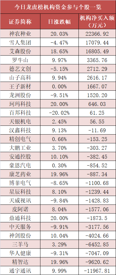 (注:此表为主力资金净流入统计,与上一张表及下一张表的机构净买入统计口径均不同) 5. 龙虎榜机构抢筹多股 盘后龙虎榜数据显示,机构现身多股,其中神农种业等股票呈现机构资金净买入,通宇通讯等股票呈现机构资金净卖出。