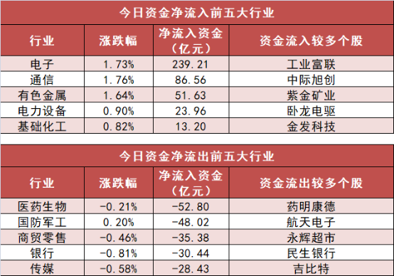3. 电子行业净流入239.21亿元居首 申万一级行业中,10个行业实现资金净流入,其中电子行业净流入239.21亿元居首。
