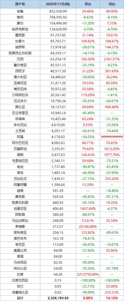 海关统计数据在线查询平台公布的数据显示,中国2025年11月铜矿砂及其精矿进口量为2,526,194.63吨,环比上升3.05%,同比上升13.13%。 秘鲁是第一大进口来源地,当月从秘鲁进口铜矿砂及其精矿852,528.99吨,环比上升29.46%,同比增加49.00%。 智利是第二大进口来源地,当月从智利进口铜矿砂及其精矿704,595.92吨,环比减少8.43%,同比减少8.10%。 以下为根据中国海关总署官网数据整理的2025年11月中国铜矿砂及其精矿进口分项数据一览表: