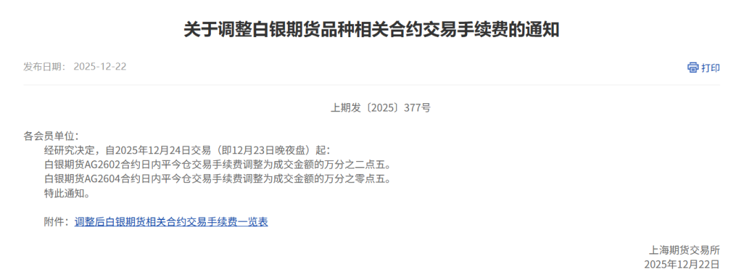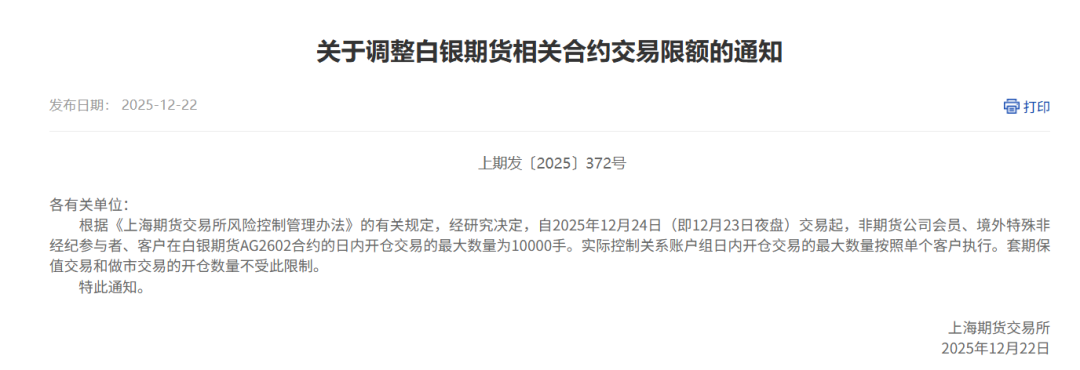 继此前提高保证金比例和涨跌停板幅度后,上海期货交易所22日再度调整白银期货的风控参数。 12月22日晚,上期所发布两则通知: 根据《上海期货交易所风险控制管理办法》的有关规定,经研究决定,自2025年12月24日(即12月23日夜盘)交易起,非期货公司会员、境外特殊非经纪参与者、客户在白银期货AG2602合约的日内开仓交易的最大数量为10000手。实际控制关系账户组日内开仓交易的最大数量按照单个客户执行。套期保值交易和做市交易的开仓数量不受此限制。 ![]() 经研究决定,自2025年12月24日交易(即12月23日晚夜盘)起: 白银期货AG2602合约日内平今仓交易手续费调整为成交金额的万分之二点五。 白银期货AG2604合约日内平今仓交易手续费调整为成交金额的万分之零点五。 ![]() 在此之前,上期所曾在12月10日宣布,自2025年12月12日(星期五)收盘结算时起,白银期货AG2602合约的涨跌停板幅度调整为15%(从14%上调),套保持仓交易保证金比例调整为16%(从15%上调),一般持仓交易保证金比例调整为17%(从16%上调)。