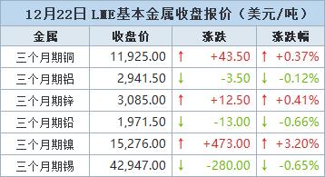 12月22日(周一),伦敦金属交易所(LME)期铜创纪录新高,受助于投机性买盘及供应短缺担忧。 伦敦时间12月22日17:00(北京时间12月23日01:00),LME三个月期铜上涨43.50美元,或0.37%,收报每吨11,925美元,盘中触及历史新高11,996美元。