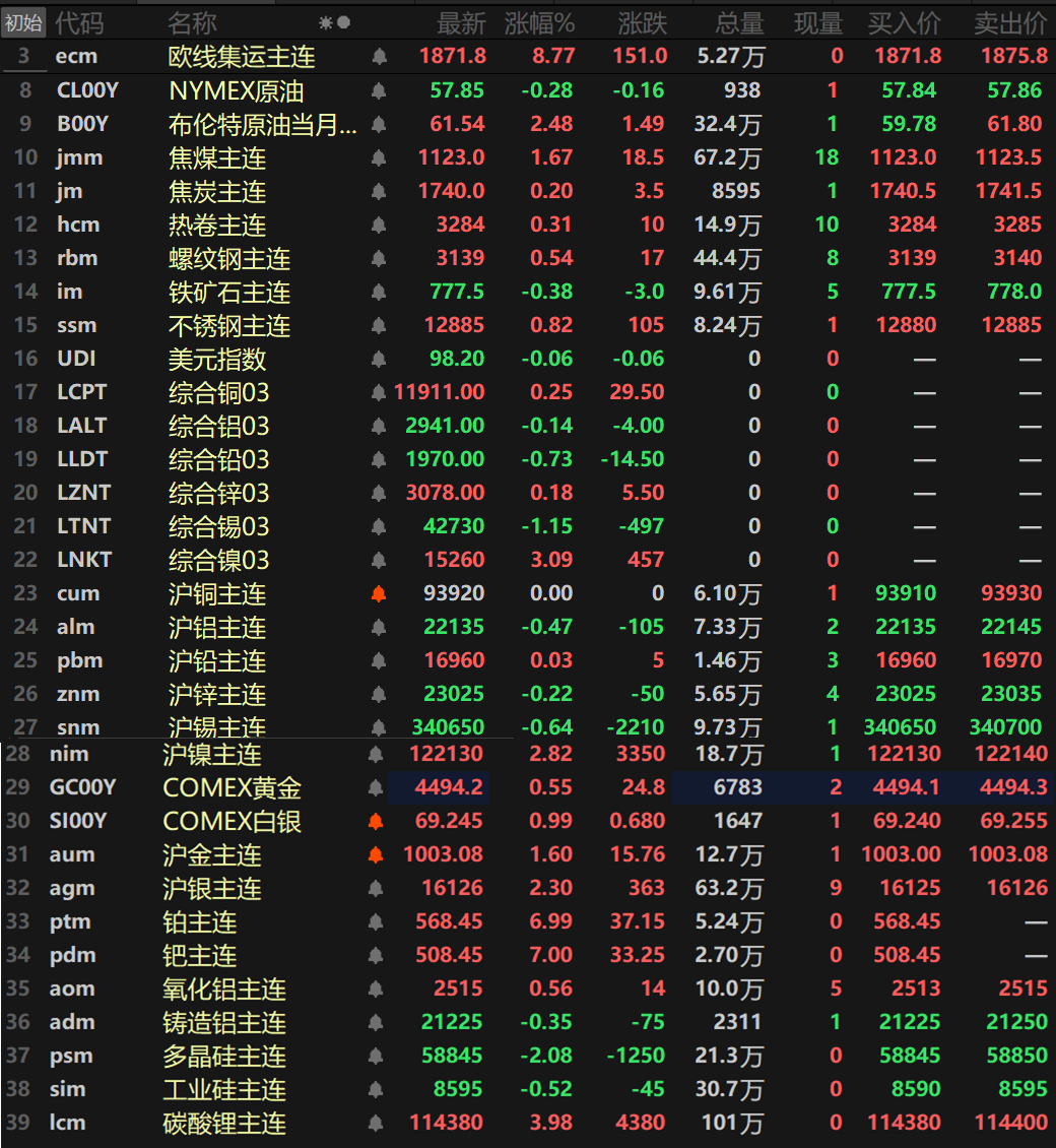 SMM12月23日讯: 金属市场方面: 隔夜内外盘金属涨跌互现,伦镍以3.09%的涨幅领涨,沪镍涨2.82%,伦锡跌1.15%,沪铜暂时持稳于93920元/吨,其余金属涨跌幅均在1%以内。氧化铝主连涨0.56%,铸造铝主连跌0.35%。 黑色系方面普涨,仅铁矿唯一下跌,跌幅达0.38%,不锈钢涨0.82%。双焦方面,焦煤涨1.67%,焦炭涨0.2%。 贵金属方面,隔夜COMEX黄金涨2.13%,12月23日早间开盘继续上涨,8点30分左右盘中最高冲至4501.7美元/盎司,续刷其上市以来的历史新高;COMEX白银隔夜上涨2.37%。国内方面,沪金涨1.6%,其盘中最高冲至1004.42元/克,续刷其上市以来的历史新高!沪银涨2.3%。 截至12月23日8:15分隔夜收盘行情