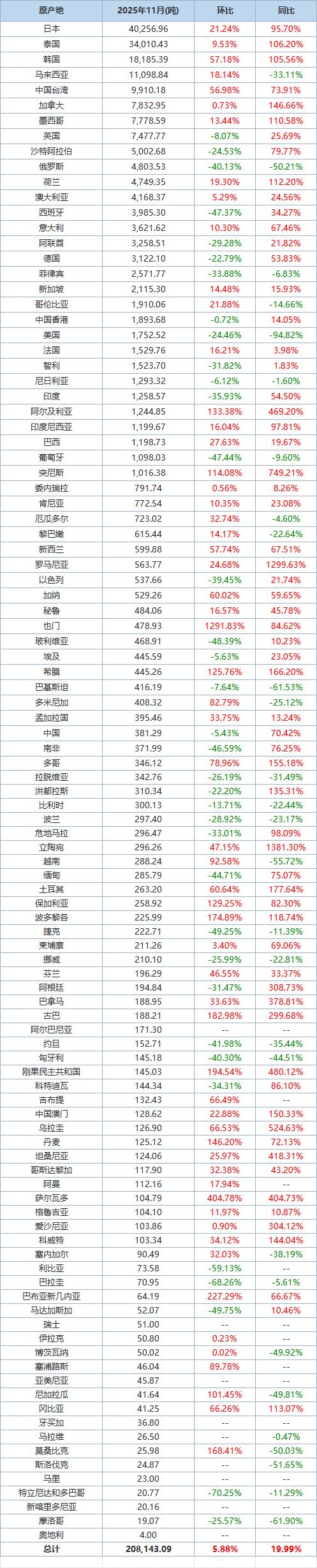 以下为根据中国海关总署官网数据整理的2025年11月废铜进口分项数据一览表: