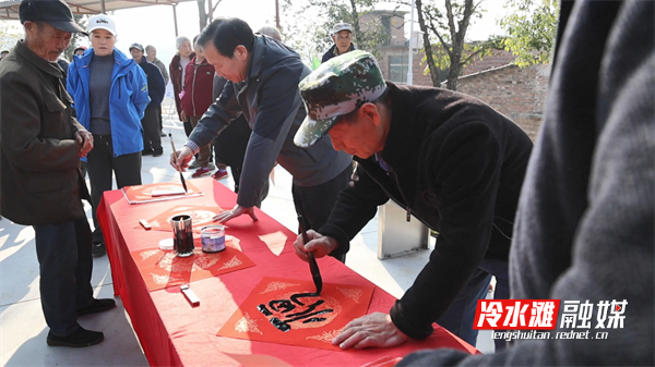 书法爱好者为村民们写福送福。蒋彦斌 摄 今年,“龙江桥祭冬民俗”成功申报区级非遗项目,成为冷水滩区第六个正式列入保护名录的乡村民俗。龙江桥村以“文化引领、产业融合、生态宜居”为主线,村组硬化道路超10公里,引入乡村研学、农事体验等项目,自今年10月份试营业以来接待游客超7000人次,乡村面貌和产业实力双提升。“我们村里现在越来越好了,我今年从外面回来,在这里做服务员,一月有两千多块钱,还可以照顾家里,我感觉蛮好。”龙江桥村村民周君华如是说。