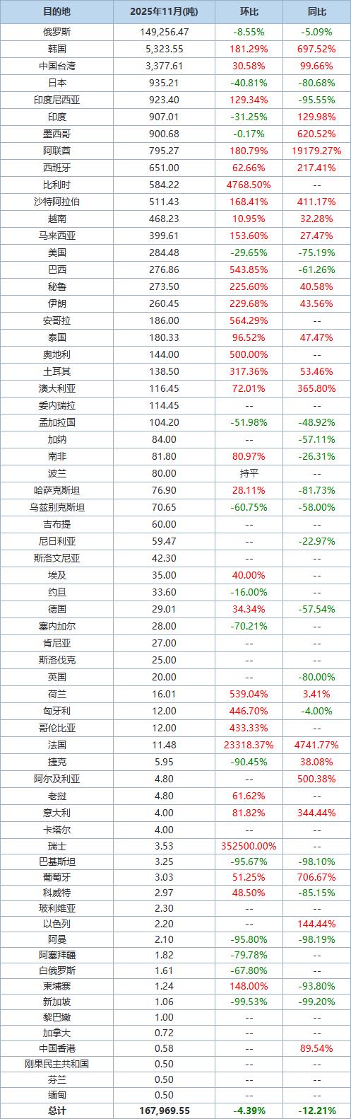 海关统计数据在线查询平台公布的数据显示,中国2025年11月氧化铝出口量为167,969.55吨,环比下降4.39%,同比下降12.21%。 俄罗斯是第一大出口目的地,当月对俄罗斯出口氧化铝149,256.47吨,环比减少8.55%,同比下降5.09%。 韩国是第二大出口目的地,当月对韩国出口氧化铝5,323.55吨,环比增加181.29%,同比上升697.52%。 以下为根据中国海关总署官网数据整理的2025年11月氧化铝出口分项数据一览表: ![]()
