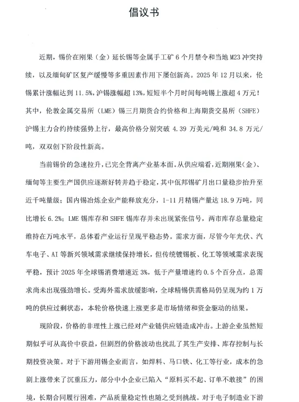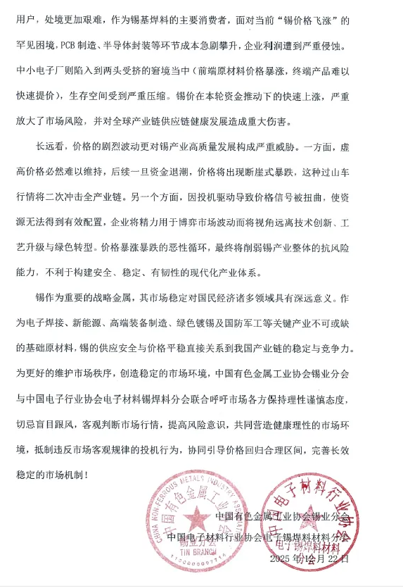 近期,锡价在刚果(金)延长锡等金属手工矿6个月禁令和当地M23冲突持续,以及缅甸矿区复产缓慢等多重因素作用下屡创新高。2025年12月以来,伦锡累计涨幅达到11.5%,沪锡涨幅超13%,短短半个月时间每吨锡上涨超4万元!其中,伦敦金属交易所(LME)锡三月期货合约价格和上海期货交易所(SHFE)沪锡主力合约持续强势上行,最高价格分别突破4.39万美元/吨和34.8万元/吨,双双创下阶段性新高。 当前锡价的急速拉升,已完全背离产业基本面。从供应端看,近期刚果(金)、缅甸等主要生产国供应逐渐好转并趋于稳定,其中佤邦锡矿月出口量稳步抬升至近千吨量级;国内锡冶炼企业产能释放充分,1-11月精锡产量达18.9万吨,同比增长6.2%;LME锡库存和SHFE锡库存并未出现紧张信号,两市库存总量稳定维持在万吨水平,总体看产业运行呈现平稳态势。需求方面,尽管今年光伏、汽车电子、AI等新兴领域需求继续保持增长,但传统镀锡板、化工等领域需求表现平稳,预计2025年全球锡消费增速近3%,低于产量增速约0.5个百分点,总需求尚未出现强劲增长。受海外需求放缓影响,全球精锡供需格局仍呈现为约1万吨的供应过剩状态,本轮价格快速上涨更多是市场情绪和资金驱动的结果。 现阶段,价格的非理性上涨已经对产业链供应链造成冲击。上游企业虽然短期似乎可从高价中获益,但剧烈的价格波动也扰乱了其生产安排、库存控制与长期投资决策。对于下游用锡企业而言,如焊料、马口铁、化工等行业,成本的急剧上涨带来了沉重压力,部分中小企业已陷入“原料买不起、订单不敢接”的困境,长期合同履行困难,产品质量稳定性也随之受到挑战。对于电子制造业下游用户,处境更加艰难,作为锡基焊料的主要消费者,面对当前“锡价格飞涨”的罕见困境,PCB制造、半导体封装等环节成本急剧攀升,企业利润遭到严重侵蚀。中小电子厂则陷入到两头受挤的窘境当中(前端原材料价格暴涨,终端产品难以快速提价),生存空间受到严重压缩。锡价在本轮资金推动下的快速上涨,严重放大了市场风险,并对全球产业链供应链健康发展造成重大伤害。 长远看,价格的剧烈波动更对锡产业高质量发展构成严重威胁。一方面,虚高价格必然难以维持,后续一旦资金退潮,价格将出现断崖式暴跌,这种过山车行情将二次冲击全产业链。另一个方面,因投机驱动导致价格信号被扭曲,使资源无法得到有效配置,企业将精力用于博弈市场波动而将视角远离技术创新、工艺升级与绿色转型。价格暴涨暴跌的恶性循环,最终将削弱锡产业整体的抗风险能力,不利于构建安全、稳定、有韧性的现代化产业体系。 锡作为重要的战略金属,其市场稳定对国民经济诸多领域具有深远意义。作为电子焊接、新能源、高端装备制造、绿色镀锡及国防军工等关键产业不可或缺的基础原材料,锡的供应安全与价格平稳直接关系到我国产业链的稳定与竞争力。为更好的维护市场秩序,创造稳定的市场环境,中国有色金属工业协会锡业分会与中国电子行业协会电子材料锡焊料分会联合呼吁市场各方保持理性谨慎态度,切忌盲目跟风,客观判断市场行情,提高风险意识,共同营造健康理性的市场环境,抵制违反市场客观规律的投机行为,协同引导价格回归合理区间,完善长效稳定的市场机制! 中国有色金属工业协会锡业分会 中国电子材料行业协会电子锡焊料材料分会 2025年12月22日