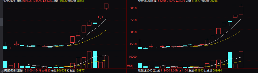 消息面上,贵金属价格继续全面上涨。今天上午,国内贵金属期货再度普遍大幅上涨,部分品种涨势进一步加速,其中广期所铂主力合约盘中触及涨停,盘中最高触及619.95元/克,再创该合约上市以来新高;广期所钯主力合约上午盘中也触及涨停,盘中最高触及555.15元/克,再创该合约上市以来新高;上期所白银期货主力合约盘中涨幅超过4%,盘中再创历史新高;上期所黄金期货主力合约也强势突破,盘中突破前段时间高点,创出历史新高。 建筑材料、电力设备、电子等板块也涨幅居前。 非银金融板块表现也较好,中国平安强势突破70元大关,股价创出最近四年新高。