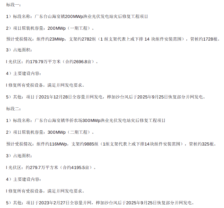 根据招标公告,项目地址位于两座光伏电站的灾后修复工程建设地点均为广东省江门市台山海宴镇,两个光伏电站因受"桦加沙"超强台风影响,光伏区受损严重,急需进行修复。