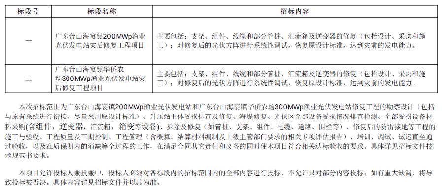 12月22日,东台山海宴镇200MWp渔业光伏发电站和广东台山海宴镇华侨农场300MWp渔业光伏发电站灾后修复工程EPC总承包中标结果公布。