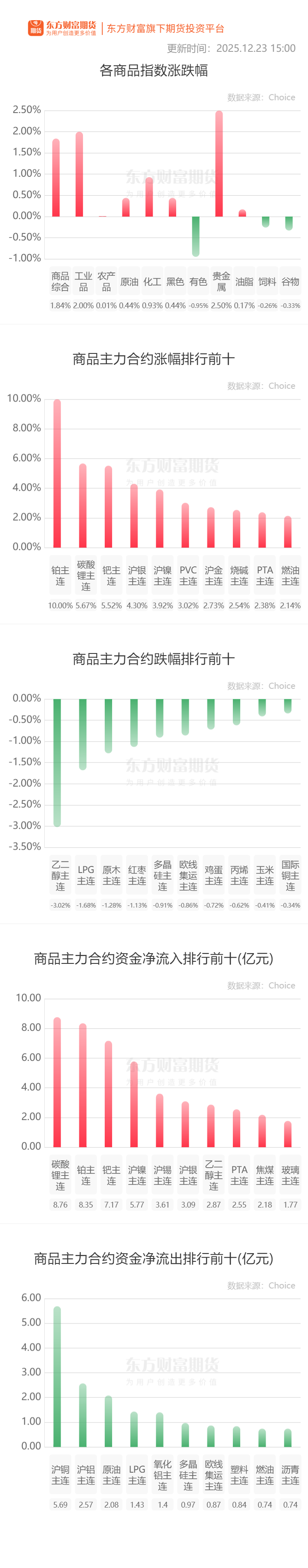 行情纵览![]() 宏观产经财联社:12月22日至23日,全国住房城乡建设工作会议在北京召开。会议指出,“十五五”时期推动房地产高质量发展,要准确把握房地产市场供求关系的重大变化,看到我国新型城镇化仍在持续推进,城市存量优化调整也有广阔空间,人民群众对“好房子”形成新期待,房地产仍有较大发展潜力。要充分认识二手房交易占比上升是今后一个时期的趋势,把新房市场和二手房市场作为一个整体来看待。 财联社:随着日元大幅下跌,日本财务大臣片山皋月周二对投机者发出了迄今为止最强烈的警告,暗示日本政府准备出手干预汇市;她表示,日本在应对日元过度波动方面拥有自主决定权;她还表示,日元大跌是投机行为所致,绝对没有反映基本面。 品种资讯黑色系期货 铁矿石:Mysteel统计中国47港进口铁矿石库存总量16436.15万吨,较上周一增加343.49万吨。周期内港口铁矿石卸货入库量增多,港口库存累库加速,压港情况环比有所改善。(我的钢铁网) 焦煤:12月23日蒙古国ETT公司炼焦煤进行线上竞拍,1/3焦原煤A9,V28-37,S1.0,G75,Mt5起拍价96.4美元/吨,挂牌数量12.8万吨全部流拍,以上价格均不含税,截至目前已连续流拍5场总计51.2万吨。供货地点为甘其毛都口岸海关监管区,供货时间为付款后99天内,最后供应日期为2026年4月1日。 12月23日蒙古国ETT公司炼焦煤进行线上竞拍,蒙5#精煤A10.5、V28.0、S0.85、Mt10.0、G80起拍价124.2美元/吨,挂牌数量6.4万吨全部成交,成交价格130.2美元/吨,较昨日上涨6美元/吨,以上价格均不含税。供货地点为甘其毛都口岸监管区,供货周期为付款后99天,最后供应日期为2026年4月1日。(我的钢铁网) 不锈钢:中国钢铁工业协会不锈钢分会数据显示,11月,中国不锈钢材进口量为11.21万吨,环比下降1.20万吨,降幅10%;同比减少1.81万吨,降幅14%。其中,自印度尼西亚进口量为8.73万吨,环比减少16%,同比减少17%。(财联社) 农产品期货 生猪:据农业农村部监测,截至12月23日14:00时,全国农产品批发市场猪肉平均价格为17.53元/公斤,较前一日下降0.2%;鸡蛋平均价格为7.48元/公斤,较前一日持平。(新华财经) 豆粕:上周国内油厂开机率回升,豆粕库存小幅增加至110万吨高位,预计下周大豆压榨量仍在210万吨以上,12月以来的豆粕去库趋势难以延续,预计月底油厂豆粕库存在100万吨左右。(国家粮油信息中心) 有色/贵金属期货 沪金:行至年末,国内、国际现货黄金价格一路走高,再次迎来“爆发式”行情。12月23日,上海黄金交易所现货黄金(Au99.99)价突破1000元/克大关,为10月17日以来首次。(上海证券报·中国证券网) 沪锡:为更好的维护市场秩序,创造稳定的市场环境,中国有色金属工业协会锡业分会与中国电子行业协会电子材料锡焊料分会联合呼吁市场各方保持理性谨慎态度,切忌盲目跟风,客观判断市场行情,提高风险意识,共同营造健康理性的市场环境,抵制违反市场客观规律的投机行为,协同引导价格回归合理区间,完善长效稳定的市场机制!(中国有色金属工业协会锡业分会) 工业硅:12月23日,SMM华东不通氧553#在9100-9300元/吨;通氧553#在9200-9300元/吨;521#在9300-9500元/吨;441#在9300-9500元/吨;421#在9500-9800元/吨;421#有机硅用在9800-10200元/吨;3303#在10200-10500元/吨。天津地区个别硅价调涨。昆明、黄埔港、新疆、上海、四川、西北地区硅价持稳。97硅今日价格同样持稳。(上海有色网) 能化期货 尿素:山东地区尿素行情僵持偏弱,小颗粒主流出厂成交1660-1720元/吨,大颗粒出厂参考1870元/吨。临沂市场一手贸易商出货参考价格1710-1720元/吨附近,菏泽市场参考价格1680-1690元/吨附近。山东瑞星装置预计周内恢复,其它企业生产基本正常。(隆众资讯) PVC:杭州PVC市场现货价格上涨,盘中受期货气氛影响明显上涨,电石法五型在4400-4550元/吨,三联4000-4450元/吨,宜化/天湖/中泰/金泰4420-4470元/吨,北元/天业4470-4550元/吨左右,八/三型4580-4620元/吨左右。(隆众资讯) 晚间关注无 (文章来源:东方财富研究中心) |