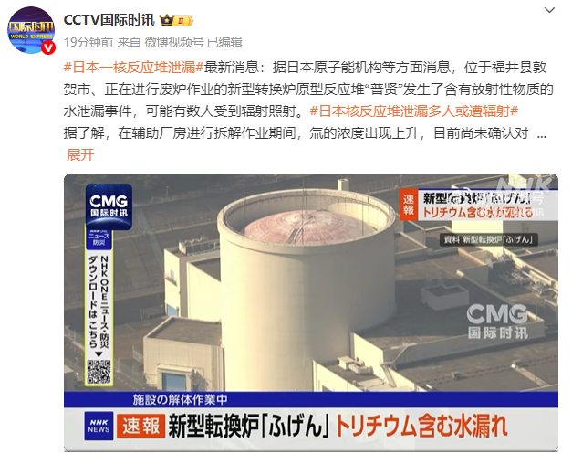 另据央视新闻,该核反应堆位于福井县敦贺市,据了解,在辅助厂房进行拆解作业期间,氚的浓度出现上升,目前尚未确认对外部环境造成影响。
