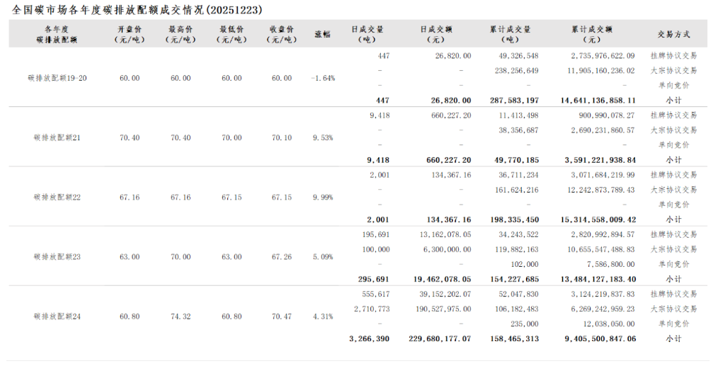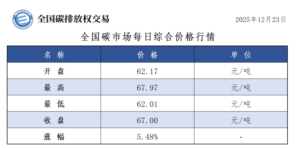 12月23日讯: 今日全国碳市场综合价格行情为: 开盘价62.17元/吨,最高价67.97元/吨,最低价62.01元/吨,收盘价67.00元/吨,收盘价较前一日上涨5.48%。 今日挂牌协议交易成交量763,174吨,成交额53,135,694.48元;大宗协议交易成交量2,810,773吨,成交额196,827,975.00元;今日无单向竞价。 今日全国碳排放配额总成交量3,573,947吨,总成交额249,963,669.48元。 2025年1月1日至12月23日,全国碳市场碳排放配额成交量218,113,166吨,成交额13,403,817,733.32元。 截至2025年12月23日,全国碳市场碳排放配额累计成交量848,381,830吨,累计成交额56,436,544,836.83元。