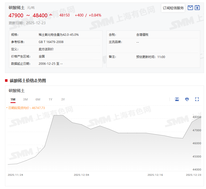 》点击查看SMM稀土现货价格 》订购查看SMM金属现货历史价格走势 12月23日,稀土市场价格表现分化。碳酸稀土12月23日的价格上调至47900~48400元/吨,其均价为48150元/吨,较前一交易日涨0.84%。而氧化物市场方面,氧化镨钕价格上调至59.2-59.8万元/吨,氧化镝价格稳定在134-135万元/吨,氧化铽价格稳定在602-606万元/吨,氧化钆价格稳定在15.6-15.8万元/吨;氧化钬价格稳定在48.8-49.4万元/吨,氧化铒价格继续在35-35.4万元/吨之间波动。 当前,稀土市场表现出明显的价格分化趋势:镨钕价格持续上涨,而中重稀土价格则保持稳定。在镨钕市场上,由于氧化物现货供应量减少,市场惜售情绪浓厚,持货商不愿低价出货,导致市场价格进一步上调。同时,金属市场的报价也因氧化物成本上升而有所提高,但由于下游磁材企业需求疲软,金属市场交易冷清,高价成交难度大,金属倒挂现象进一步加重。至于中重稀土市场,同样受到下游需求不足的影响,整体询单活动较少,价格维持平稳。总体来看,尽管下游磁材企业的采购意愿不高,但受氧化镨钕供应紧张影响,镨钕产品的价格仍呈现小幅上涨态势,其余稀土产品价格整体平稳运行。预计短期内,镨钕类产品价格将可能继续保持高位震荡。 推荐阅读: 》未列名氧化稀土进口稳定 钍矿砂进口或继续扩张【SMM分析】 》市场惜售情绪蔓延 镨钕价格继续上涨【SMM稀土日评】 |