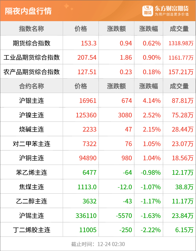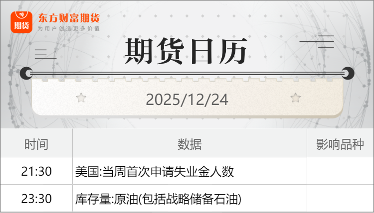 隔夜行情![]() ![]() 每日精选史上首次!现货白银向上触及70美元/盎司 伦铜站上12000美元/吨 一度高达18%!多晶硅交割价与现货巨大价差引热议 广期所回应 广期所:调整铂等品种相关期货合约交易手续费标准、涨跌停板幅度和交易保证金标准 宏观产经新华社:中央企业负责人会议12月22日至23日在京召开。中共中央政治局常委、国务院总理李强出席会议并讲话。李强指出,要在推进重大基础设施建设中提供强力保障,加快传统基础设施更新和数智化改造,适度超前开展新型基础设施建设。要在实现产业链供应链自主可控中当好担纲主力,结合主责主业发展新兴产业和未来产业,保障能源资源供应,增强产业链韧性。要在推进高水平科技自立自强中强化基础支撑,加强应用基础研究,提升关键共性技术供给质量。 中国建设报:全国住房城乡建设工作会议12月22日至23日在北京召开。会议指出,在商品房销售上,推进现房销售制,实现“所见即所得”,从根本上防范交付风险。继续实行预售的,规范预售资金监管,切实维护购房人合法权益。同时,深化住房公积金制度改革。实施物业服务质量提升行动,探索社区党组织领导下的居委会、业委会、物业服务企业协调运行新模式,探索“物业服务+生活服务”模式,推动“物业服务进家庭”。 商务部网站:商务部新闻发言人就美针对无人机领域增列“不可信供应商清单”事答记者问。美方以所谓“国家安全”为由,将所有外国生产的无人机系统及其关键零部件等列入“不可信供应商清单”,中方对此坚决反对。近年来,美方不顾中美两国企业开展正常商业交易和贸易往来,不顾中美两国业界的强烈呼声,一再泛化国家安全概念,动用国家力量打击包括中国企业在内的他国企业,这是典型的市场扭曲和单边霸凌做法。 品种资讯黑色系期货 钢材:12月中旬,21个城市5大品种钢材社会库存748万吨,环比减少47万吨,下降5.9%,库存降幅继续扩大;比年初增加89万吨,上升13.5%;比上年同期增加77万吨,上升11.5%。(中钢协) 世界钢铁协会数据显示,2025年11月,全球粗钢产量为1.401亿吨,同比减少4.6%。(新华财经) 焦煤:12月23日蒙古国ETT公司炼焦煤进行线上竞拍,蒙5#精煤A10.5、V28.0、S0.85、Mt10.0、G80起拍价124.2美元/吨,挂牌数量6.4万吨全部成交,成交价格130.2美元/吨,较昨日上涨6美元/吨,以上价格均不含税。供货地点为甘其毛都口岸监管区,供货周期为付款后99天,最后供应日期为2026年4月1日。(我的钢铁网) 不锈钢:中国钢铁工业协会不锈钢分会数据显示,11月,中国不锈钢材进口量为11.21万吨,环比下降1.20万吨,降幅10%;同比减少1.81万吨,降幅14%。其中,自印度尼西亚进口量为8.73万吨,环比减少16%,同比减少17%。(财联社) 农产品期货 生猪:据农业农村部监测,截至12月23日14:00时,全国农产品批发市场猪肉平均价格为17.53元/公斤,较前一日下降0.2%;鸡蛋平均价格为7.48元/公斤,较前一日持平。(新华财经) 棕榈油:随着到港量逐步增加,上周棕榈油库存再度回升,但12-1月船期采购不多,继续关注棕榈油实际到港情况。监测数据显示,截止到2025年第51周末,国内棕榈油库存总量为63.5万吨,较上周的60.2万吨增加3.3万吨;合同量为3.8万吨,较上周的3.6万吨增加0.2万吨。(中国粮油商务网) 大豆:监测数据显示,截止到2025年第51周末,国内进口大豆库存总量为772.2万吨,较上周的805.5万吨减少33.3万吨,去年同期为591.9万吨,五周平均为787.5万吨。其中:沿海库存量为670.5万吨,较上周的694.5万吨减少24.0万吨,去年同期为499.9万吨,五周平均为673.9万吨。(中国粮油商务网) 有色/贵金属期货 沪金:上海黄金交易所发布关于继续加强近期市场风险控制工作的通知:近期影响市场不稳定的因素较多,贵金属价格波动剧烈。请各会员提高风险防范意识,继续做好风险应急预案,维护市场平稳运行。同时,提示投资者做好风险防范工作,合理控制仓位,理性投资。(财联社) 沪银:现货白银向上触及70美元/盎司,为历史首次,日内上涨1.45%。现货白银今年累计已上涨142%。(Choice数据) 沪铜:北京时间周二(12月23日)晚间,连续上涨近1个月的伦铜期货突破每吨12000美元,这也是该关键工业金属历史首次达到这一整数关口。(财联社) 碳酸锂:12月23日碳酸锂现货价格持续上行。电池级碳酸锂指数价格99575元/吨,环比上一工作日上涨455元/吨;电池级碳酸锂9.64-10.26万元/吨,均价9.95万元/吨,环比上一工作日上涨500元/吨;工业级碳酸锂9.51-9.86万元/吨,均价9.685万元/吨,环比上一工作日上涨500元/吨。(上海有色网) 多晶硅:广州期货交易所公告称,根据《广州期货交易所风险管理办法》,经研究决定,自2025年12月25日交易时起,非期货公司会员或者客户在多晶硅期货PS2601、PS2602、PS2603、PS2604、PS2605、PS2606、PS2607、PS2608、PS2609、PS2610、PS2611、PS2612合约上单日开仓量分别不得超过200手。(财联社) 能化期货 原油:高盛在12月发布的大宗商品展望报告中指出,疫情前批准的长周期项目如同“沉睡的巨人”,预计将在2026年集中苏醒,叠加OPEC+解除减产的战略选择,2026年全球原油市场日均过剩量将达200万桶,这一波供应浪潮预计在2026年底才能画上句号。(财联社) 尿素:12月23日山东地区尿素行情僵持偏弱,小颗粒主流出厂成交1660-1720元/吨,大颗粒出厂参考1870元/吨。临沂市场一手贸易商出货参考价格1710-1720元/吨附近,菏泽市场参考价格1680-1690元/吨附近。山东瑞星装置预计