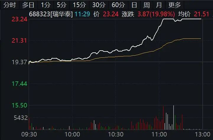 国防军工概念股早间集体上攻,多股20%涨停。消费电子概念大涨,瑞华泰临近午间收盘20%涨停。 12月24日早盘,A股整体围绕昨日收盘点位微幅震荡,上证指数、深证成指、创业板指、科创50等均微幅飘红,大盘蓝筹股有所调整,上证50、沪深300均微幅飘绿。上涨个股远多于下跌个股,市场成交呈小幅萎缩的趋势。 盘面上,商业航天、玻璃玻纤、消费电子、包装印刷等板块涨幅居前,动物保健、游戏、煤炭、电信服务等板块跌幅居前。 商业航天再迎多重利好 国防军工概念股早间集体上攻,商业航天领域继续保持高度活跃状态,板块指数再创历史新高。谱尼测试、超捷股份、新雷能等多股20%涨停,九鼎新材高开后秒速涨停,连续第2日封板,合众思壮略微低开后仅约1分钟垂直涨停,天工股份、天通股份等逾20股涨停或涨超10%。