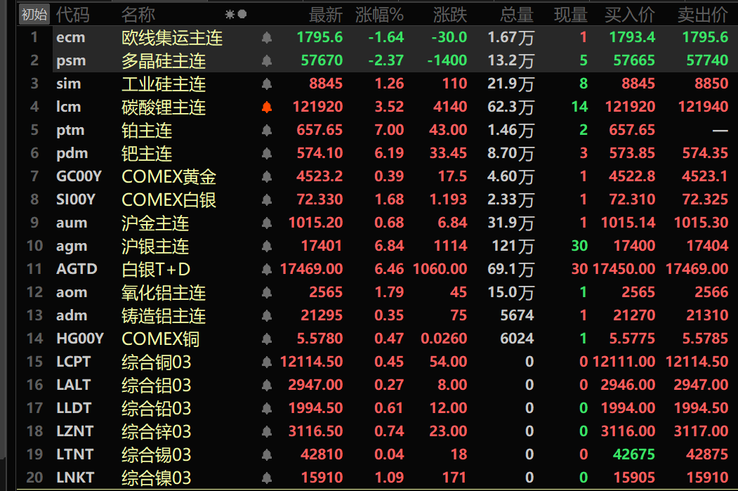 SMM12月24日讯: 金属市场方面: 截至午间收盘,内盘基本金属普涨,沪铜涨1.39%。沪铝涨0.52%。沪铅涨1.33%,沪锌涨0.96%。沪锡跌1.15%,沪镍涨4.52%。 此外,铸造铝主连期货涨0.35%,氧化铝主连涨1.79%。碳酸锂主连涨3.52%。工业硅主连涨1.26%。多晶硅主连跌2.37%。 黑色系多飘红,铁矿平于777.5元/吨,螺纹涨0.19%,热卷涨0.24%,不锈钢涨1.32%。双焦方面:焦煤主力合约涨1.24%,焦炭主力合约涨0.49%。 外盘金属方面,截至11:46分,LME金属均飘红,伦铜徘徊在历史高位附近,涨0.45%,伦铅涨0.67%。伦铝涨0.21%,伦锌涨0.74%。伦锡涨0.04%。伦镍涨1.09%。 贵金属方面,截至11:46分,COMEX黄金涨0.39%,盘中刷新历史新高至4555.1美元/盎司;COMEX白银涨1.68%,盘中刷新历史新高至72.75美元/盎司。内盘贵金属方面:沪金主连涨0.68%,盘中刷新历史新高至1022.88元/克;沪银主连涨6.84%,盘中刷新历史新高至17487元/千克。 此外,截至午间收盘,铂主连期货延续前两个交易日的涨停态势,继续以7%的涨幅涨停,刷新上市以来的纪录至657.65元/克;钯主连期货涨6.19%,刷新上市以来的纪录至578.25元/克。 》广期所:调整铂等品种相关期货合约交易手续费标准、涨跌停板幅度和交易保证金标准 截至午间收盘,欧线集运主力合约跌1.64%,报1795.6点。 截至12月24日11:46分,部分期货午间行情: