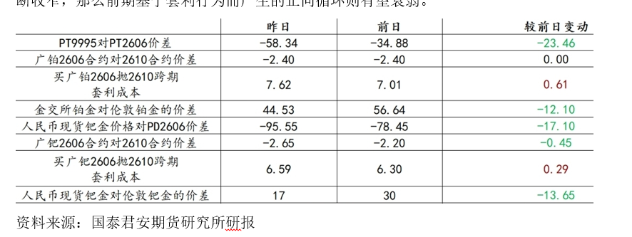 2、现货、外盘与内盘的价差 先前铂钯品种的期现基差与内外价差均处于高位区间,吸引大量期现套利和内外盘套利资金入场。这些资金增持现货库存,直接推高现货报价,而现货走强又传导至期货市场,引发投机资金跟多情绪,形成“现货紧俏→期货升水→套利囤货→现货更紧”的循环,放大价格波动弹性。 因此对于价差的关注,可能也能成为市场推涨动力的另一个观测点,如果看到价差在不断收窄,那么前期基于套利行为而产生的正向循环则有望衰弱。