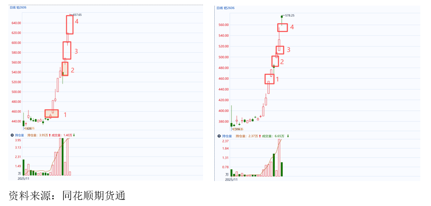 3、盘面上冲中的价量仓 从技术层面看,当前铂金、钯金期货主力合约已连续形成四个向上跳空且未回补的缺口,这已符合缺口理论所提示的短期涨势可能过快的风险信号。若后续价格在未回补缺口的情况下继续跳空上行,盘中累积的风险将进一步加剧。 此外,通常稳健的上涨行情往往伴随着持仓与成交量的温和放大。本轮上涨主要由资金推动,前几日虽一度出现缩量,但近日有所修复。后续需密切关注持仓与成交变化,尤其是若出现减仓迹象,这或许是盘面节奏变化的关键观察点。(自12月12日上涨开启以来,铂钯主力合约每日都在增仓,暂未出现减仓)