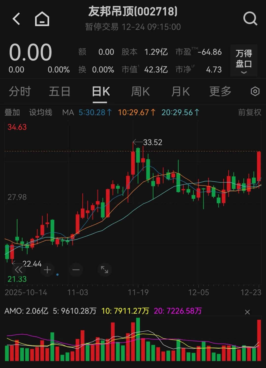 盘面上,有色金属、存储芯片、稀土永磁等板块走强,6G概念、商业航天、海南自贸概念等板块跌幅居前。 个股方面,中际旭创盘中一度涨逾2%,创新高,市值近7000亿元。 另外,友邦吊顶(002718)12月24日早间披露公告称,公司筹划控制权变更事项,经公司申请,公司股票于12月24日起临时停牌。此前,友邦吊顶股价于12月23日涨停收盘。截至当日收盘,公司报涨停价32.67元/股,总市值42.29亿元。