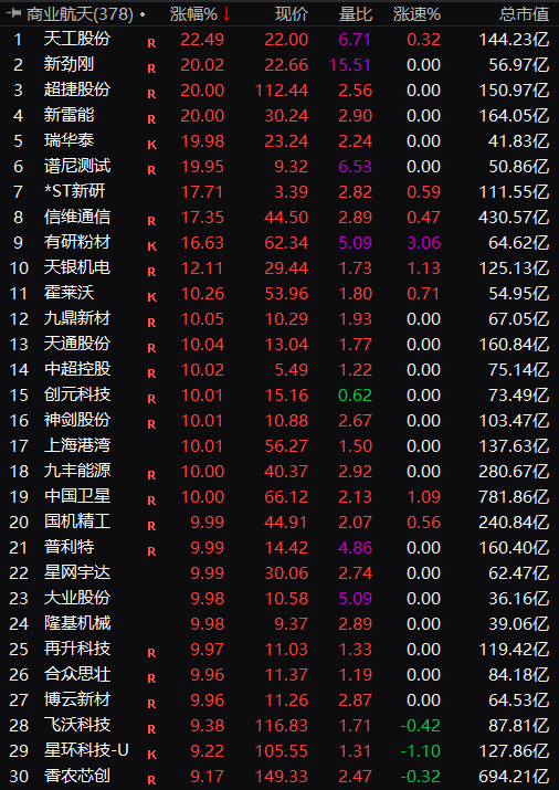 超级赛道大爆发。 今日,A股商业航天概念股集体爆发,狂掀涨停潮,近20只成份股强势涨停,其中新劲刚、超捷股份、新雷能等个股斩获20%涨停。消息面上,2025第三届商业航天发展大会暨第四届中关村商业航天大会定于2025年12月24日在北京召开,商业航天进入密集催化期。 有券商机构认为,中国商业航天产业正进入新一轮高速发展期,大运力、低成本趋势正引领商业航天开启新时代,同时空间算力也进一步打开行业天花板,万亿级市场规模的新赛道即将加速爆发,为相关产业链带来巨大的发展契机。 涨停潮 12月24日,A股开盘后,商业航天板块再度爆发,截至午间收盘,板块内共计27股涨停或涨超10%,具体来看,天工股份涨超22%,新劲刚、超捷股份、新雷能、瑞华泰、谱尼测试斩获20%涨停,信维通信、有研粉材、天银机电、霍莱沃大涨超10%,中国卫星、九鼎新材、中超控股、创元科技、神剑股份、合众思壮、再升科技、九丰能源等录得10%涨停。