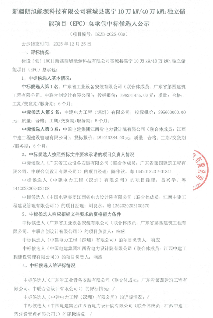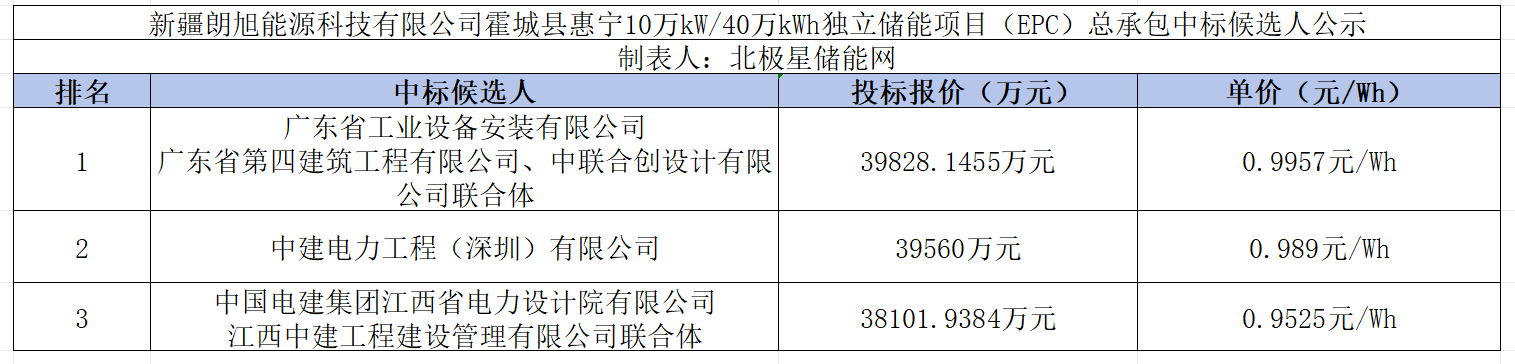 北极星储能网获悉,12月22日,新疆朗旭能源科技有限公司霍城县惠宁10万kW/40万kWh独立储能项目(EPC)总承包中标候选人公示。 据公告,第一中标候选人为广东省工业设备安装有限公司、广东省第四建筑工程有限公司、中联合创设计有限公司联合体,投标报价为39828.1455万元,折合单价0.9957元/Wh; 第二中标候选人为中建电力工程(深圳)有限公司,投标报价为39560万元,折合单价0.989元/Wh; 第三中标候选人为中国电建集团江西省电力设计院有限公司、江西中建工程建设管理有限公司联合体,投标报价为38101.9384万元,折合单价0.9525元/Wh。