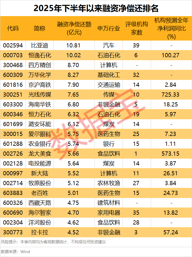 下半年以来,171股融资净偿还额超过1亿元。其中,比亚迪、恒逸石化逾10亿元,分别为10.81亿元、10.02亿元;四方精创、万华化学、京沪高铁、光线传媒、海南华铁、恒力石化、潞安环能等7股融资净偿还额均在6亿元以上。 潞安环能、电投能源等多只煤炭股遭到融资资金净偿还。国联民生证券指出,展望2026年,煤炭供需格局有望明显改善,供给端由2025年上半年的过剩转变为均衡甚至略显不足,预计动力煤2026年价格中枢有望上移,建议积极布局煤炭板块。