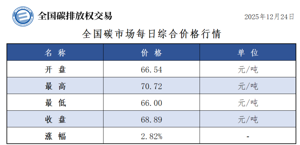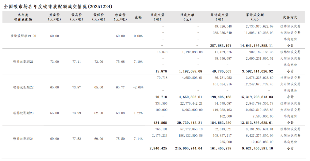 12月24日讯: 今日全国碳市场综合价格行情为: 开盘价66.54元/吨,最高价70.72元/吨,最低价66.00元/吨,收盘价68.89元/吨,收盘价较前一日上涨2.82%。 今日挂牌协议交易成交量1,186,352吨,成交额86,392,187.08元;大宗协议交易成交量2,275,234吨,成交额165,095,890.86元;今日无单向竞价。 今日全国碳排放配额总成交量3,461,586吨,总成交额251,488,077.94元。 2025年1月1日至12月24日,全国碳市场碳排放配额成交量221,574,752吨,成交额13,655,305,811.26元。 截至2025年12月24日,全国碳市场碳排放配额累计成交量851,843,416吨,累计成交额56,688,032,914.77元。
