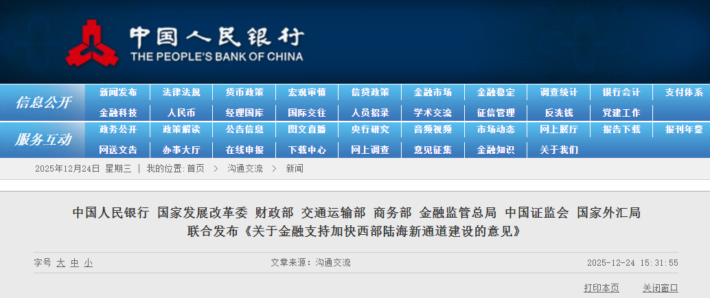 金融支持加快西部陆海新通道建设“21条”出炉! 为完善西部陆海新通道金融服务体系,中国人民银行等八部门12月24日联合发布《关于金融支持加快西部陆海新通道建设的意见》(下称《意见》),要求充分发挥好“融资”和“结算”两项金融核心功能,全面完善西部陆海新通道金融服务体系,显著增强跨省(区、市)、跨境金融要素配置能力。 《意见》从完善金融组织协作体系,构建高质量资金融通体系,推进制度性改革创新,建设数字金融服务平台,完善金融开放合作体系,深化跨省跨境金融监管协作等六个方面提出21条重点举措。 根据《意见》安排,未来西部陆海新通道将获得更大力度的金融资源统筹支持,资金结算便利体系将得到进一步优化,人民币跨境使用将进一步扩大。未来,重庆将设立西部陆海新通道基金,支持沿线基础设施和产业园区建设。未来我国还将建设覆盖沿线省(区、市)的“央行西部陆海智融通”综合金融服务平台。