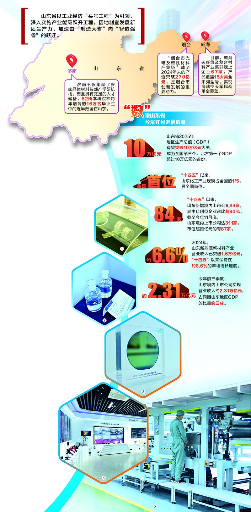 链主领航生态共建 以比较优势释放新兴产业发展潜能 “鼓励各地发挥比较优势、各展所长。”“十五五”规划建议中提出的明确指引,与山东的实践不谋而合。记者在调研时获悉,山东立足自身产业禀赋前瞻布局,在发挥比较优势、构筑特色产业生态上快马加鞭,同时以链主企业为引领,推动产业链上下游协同集聚,形成“引进一个、带动一批、辐射一片”的生态效应。 作为济南首批“5150”人才之一,胡文回国创业时毅然选择落地济南,有其战略考量。这里集聚了山东大学晶体材料研究所、中国建材人工晶体研究院、天岳先进等晶体材料头部产学研机构。更重要的是,济南具有充足的人才储备,52所本科院校每年培育的16万名毕业生中的近半数留在山东,人才储备十分丰富。 如果说当地科研资源、人才红利精准契合晶正电子需求,那么地方政府全方位的支持,则让公司拥有长期深耕济南的底气。胡文说,从启动资金到实验室建设,从厂房建设到研发费用支持,济南全链条为公司分忧解难,助力公司茁壮成长。目前,公司已融资4轮,估值一路上行。 得益于全周期、保姆式的培育与支持,济南在铌酸锂产业的优势加速集聚:晶正电子主导纳米级铌酸锂薄膜国家标准制定,山东恒元半导体科技有限公司在全球率先突破12英寸铌酸锂晶体生长技术。在此基础上,济南更是将发展第三代半导体材料列为战略性方向,前瞻性布局第四代半导体材料,持续放大当地在铌酸锂领域的技术与产业优势。 依托地方资源禀赋,链主领航共建产业生态的案例,不在少数。睿创微纳的成长与烟台光电及磁性材料产业的发展同频共振,作为龙头企业,领建烟台光电传感产业园,带动产业链上下游的企业共同发展,引领产业集群形成。截至2024年末,“烟台市光电及磁性材料产业链”产值突破270亿元,是烟台市创新发展的重要动力。 在链主光威复材带动下,威海已将碳纤维及复合材料产业列为全市八大产业之一、十条优势产业链之一进行重点培育。目前,威海碳纤维及复合材料产业集群规上企业67家,产品覆盖15大类全系列型号,实现海陆空天军民两用全覆盖。其中,碳纤维钓具市场份额超60%,本地配套率超80%。 济南铌酸锂、烟台光电及磁性材料以及威海碳纤维的集群化发展,正是山东新材料产业加速崛起的剪影。当前,山东已将新材料产业摆在“十强”产业发展突出位置,特别是将功能复合材料等纳入标志性产业链进行重点培育。山东省工信厅数据显示,2024年,山东新能源新材料产业营业收入已突破1.6万亿元,“十四五”以来保持在约6.6%的年均增长速度,领军企业库已汇聚594家企业,国家级制造业单项冠军52家。 根据去年12月发布的《山东省新材料产业科技创新行动计划(2025—2027年)》,山东正围绕先进基础材料、关键战略材料和未来前沿材料重点领域,推动科技创新与产业创新深度融合发展,力争到2027年,新材料产业加快迈向价值链高端,建成具有国际竞争力的新材料产业创新高地。该行动计划透露,山东将研究大尺寸碳化硅、氮化镓等第三代半导体材料制备技术和装备,攻克超宽禁带金刚石单晶、氮化铝生长及器件技术,满足面向集成电路、芯片产业领域的自主可控技术需求。 集成电路设计公司多扎堆北上广,生产制造企业多集聚于长三角与珠三角,山东大力发展集成电路材料产业优势何在?新恒汇董事长任志军对此的解释是,山东在集成电路领域的优势在于材料领域,材料的生产工艺本质是化学,山东的化工材料基础国内领先。 山东化工产业多年稳坐全国化工产业经济总量的冠军宝座。“十四五”以来,山东化工产业规模占全国的1/5,居全国首位;其中,2024年,山东化工相关产业营收约2.9万亿元。