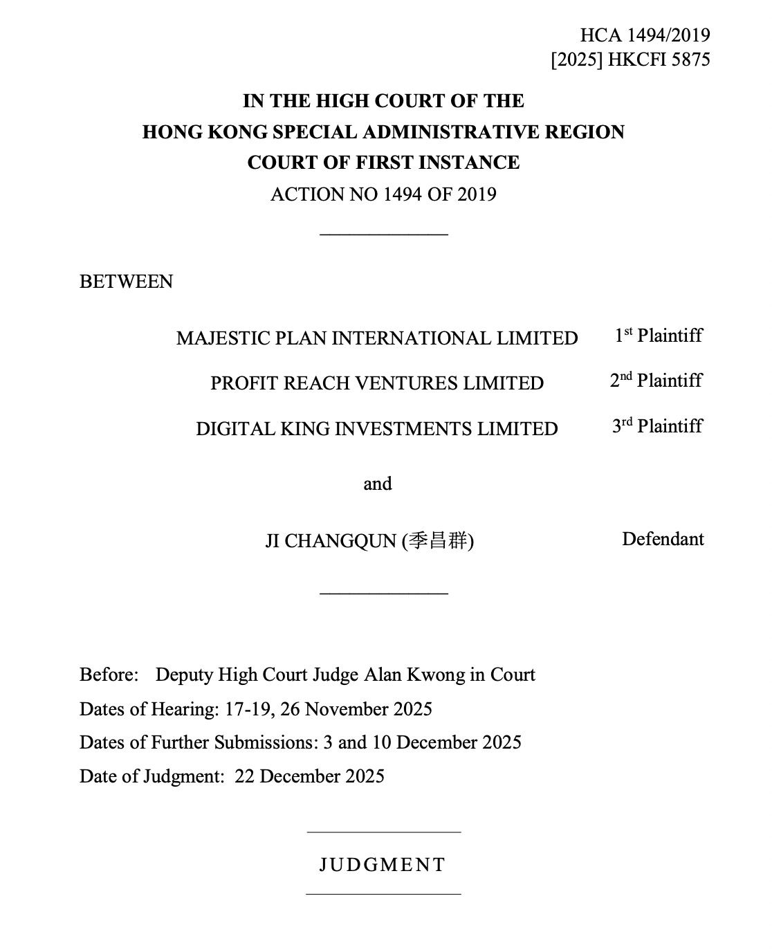 界面新闻获悉,香港高等法院近日就前“南京首富”、丰盛控股CEO兼董事会主席季昌群涉及的12亿港元钱债纠纷作出判决,裁定季昌群败诉,需向原告伟图国际有限公司、利达创投有限公司偿还本金约8.98亿港元及相应利息,叠加利息后总债务规模或达12亿港元。