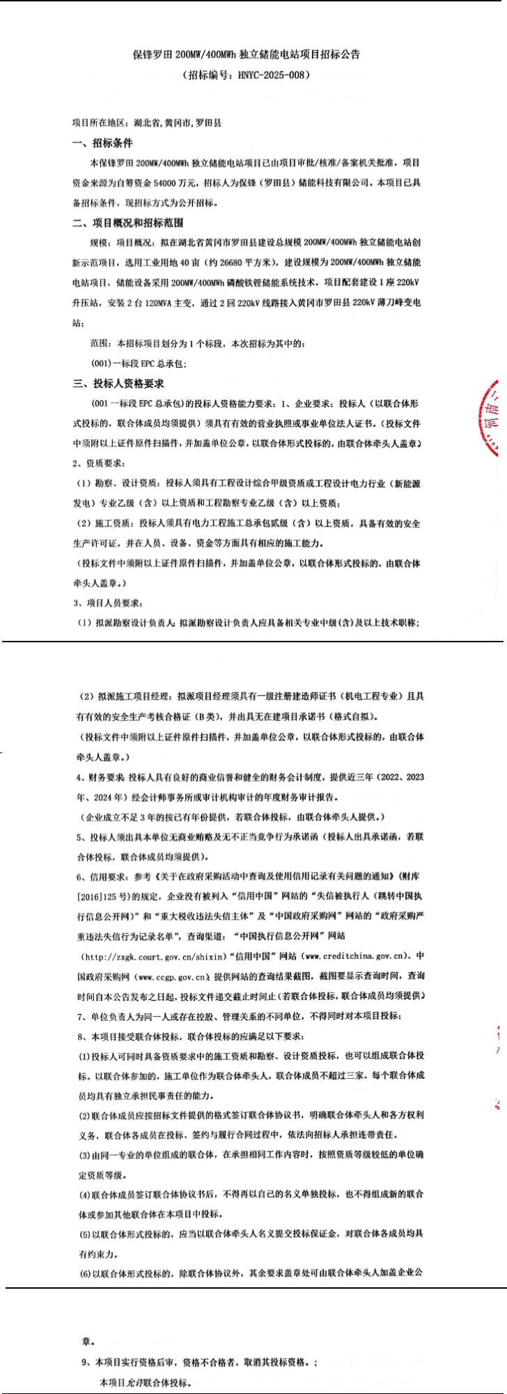 12月24日,保锋(罗田县)储能科技有限公司发布保锋罗田200MW/400MWh独立储能电站项目招标公告,项目位于湖北省黄冈市罗田县,项目总投资54000万元(约合1.35元/Wh),资金来源为企业自筹。