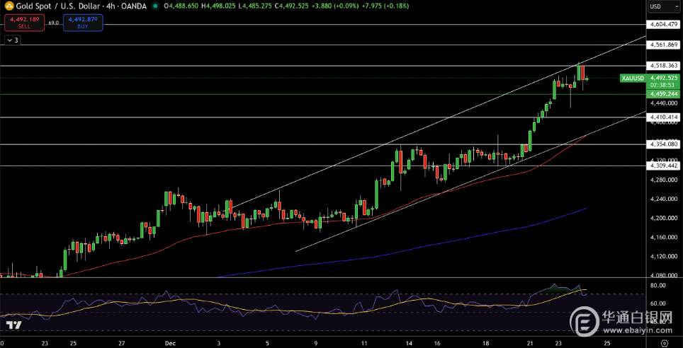 【华通白银网12月25日】•美国GDP 4.3%的强劲增长缓和了上行空间,但消费者信心疲软令风险情绪保持谨慎。 •市场已消化对2026年美联储多次降息的预期,从而降低了收益率前景,进而强化了黄金和白银的看涨基础。 •供应方面的不确定性和贸易中断加剧了假日交易清淡期间黄金和白银的防御性资金流入。 市场概述 周三,在宏观经济信号、政策预期以及全球市场供应面不确定性加剧的综合支撑下,黄金和白银在欧洲交易中延续了势头。 随着年末流动性趋于稀薄,投资者重新展现出将贵金属作为投资组合对冲工具的偏好,而非短期交易。 供应风险和市场谨慎提振贵金属 贵金属持续受益于因全球贸易中断和能源相关供应问题而抬升的风险意识。近期关键生产地区影响航运和大宗商品流动的立法举措,为全球市场增添了一层不确定性,促使投资者转向配置黄金、白银等传统上被视为价值储藏资产的品种。 在假日交易清淡的情况下,这种防御性仓位放大了流入黄金和白银的资金,增强了它们作为宏观对冲工具而非纯粹投机工具的吸引力。 货币政策预期驱动投资者仓位 对宽松货币政策的预期仍是主要驱动因素。随着通胀趋势趋软,劳动力市场势头显示出降温迹象,市场越来越多地预计美联储将在2026年多次降息。较低的利率往往有利于黄金和白银等无息资产,从而降低了持有这些资产的机会成本。 根据芝加哥商品交易所的美联储观察数据,降息可能性在最近几周发生了有意义的变化,反映出人们对政策收紧周期已经结束的信心日益增强。 强劲的增长数据缓和了投资者的热情 这种支撑被美国经济数据的弹性部分抵消。美国经济分析局报告称,美国经济第三季度的年化增长率为4.3%,远高于普遍预期。强劲的经济增长通常会支撑美元,这可能会限制贵金属的上涨势头。 与此同时,消费者信心数据走软,世界大型企业联合会12月消费者信心指数下滑至89.1,表明美国家庭存在潜在的谨慎情绪。 在投资者展望关键的劳动力市场指标之际,黄金和白银仍处于货币预期和全球风险管理的交叉点,这一平衡可能会决定明年的价格走势。 短期预测 金价在4,492美元附近盘整,支撑位位于4,460美元,瞄准4,580美元,银价守住72.27美元,高于70.65美元,瞄准73.80-75.30美元,如果动能持续,因假日流动性减弱,且降息预期仍有支撑。 黄金价格预测:技术分析