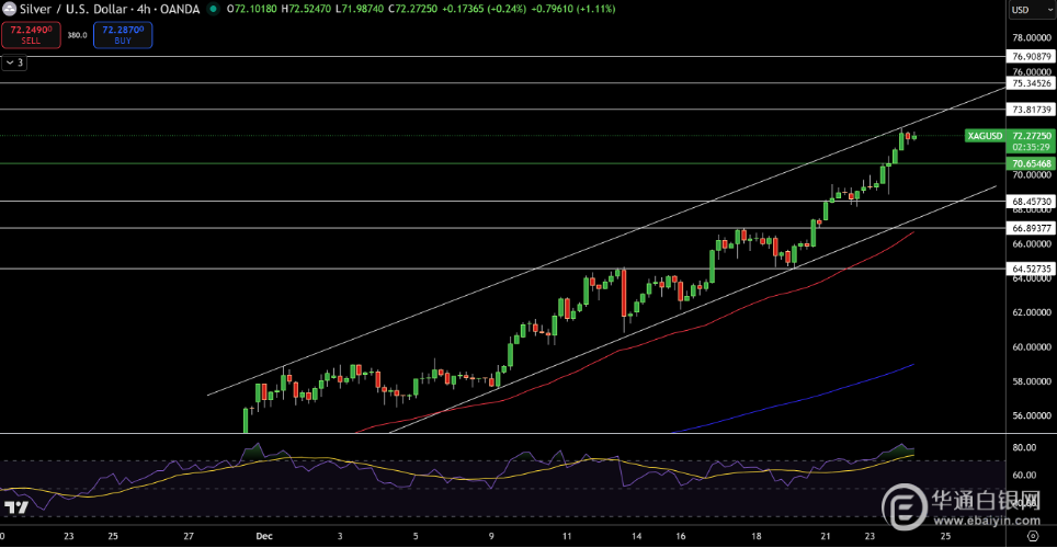 银价在72.27美元附近交易,在大幅上涨后进行盘整,该上涨将银价推入上升通道的上边界。在一系列明显的高点和低点的支撑下,整体趋势仍然坚定看涨。价格保持在70.65美元附近的前突破区域上方,该区域现在是第一个支撑位。 50 EMA涨至66.90美元附近,而100 EMA仍远低于66.90美元,证实了趋势的强劲而非枯竭。近期蜡烛走势显示,白银对在73.80美元附近的盘整幅度较小,暗示短期盘整而非反转。相对强弱指标徘徊在70附近,处于高位,但没有看跌背离,表明动能强劲但正在降温。 只要银价守住70.65美元上方,向73.80美元和75.30美元的上行风险依然存在。向通道底部进一步回调仍将使看涨结构保持完整。交易思路是在70.70美元附近买入,目标在75.00美元,止损在69.50美元以下。 截止北京时间09:40,华通现货白银定盘价报17134元。 白银网 |