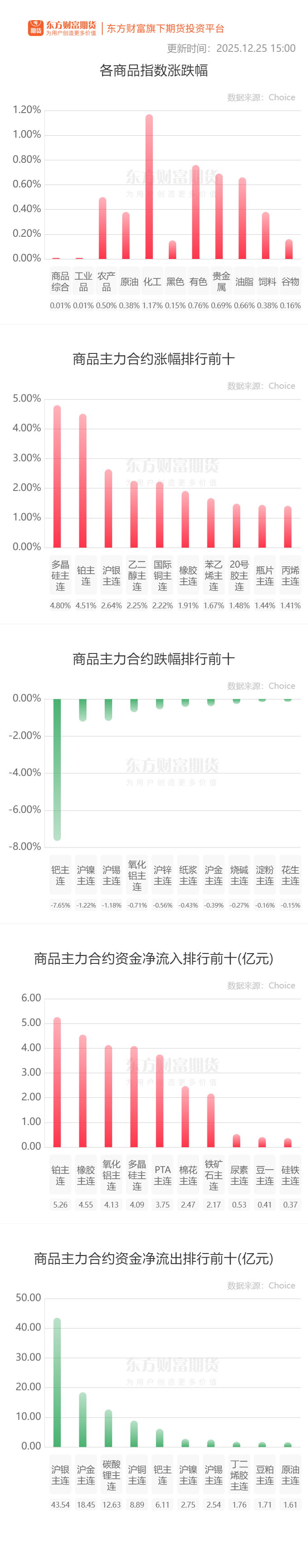 行情纵览![]() 宏观产经CCTV国际时讯:乌克兰总统泽连斯基12月24日在记者简报会上公布了最新版俄乌“和平计划”草案的20点内容,并强调该框架文件“仍为草案”,其条款可能在谈判过程中有所修改。泽连斯基称,这份文件在很大程度上反映了乌克兰和美国的共同立场,部分反映了美方立场,但领土、乌克兰加入欧盟等问题仍待解决。 财联社:日本知名经济学家、日本央行前政策委员会委员原田泰(Yutaka Harada)日前呼吁,在政府全力提振经济的背景下,日本央行应当在加息方面采取谨慎态度。他在接受采访时表示,日本首相高市早苗领导的政府应充分利用财政、货币和税收政策来刺激需求,实现 “高压经济”。 品种资讯黑色系期货 钢材:据Mysteel,截至12月25日当周,螺纹钢产量连续两周增加,厂库由降转增,社库连续第十一周下降,表需由增转降:① 螺纹产量184.39万吨,较上周增加2.71万吨,增幅1.49%;② 螺纹厂库140.06万吨,较上周增加0.52万吨,增幅0.37%。(我的钢铁网) 焦煤:12月25日蒙古国ETT公司炼焦煤进行线上竞拍,A12,V28,S0.85,G>80,Mt10起拍价95.2美元/吨,较上期10日下跌1.0美元/吨,挂牌数量1.28万吨全部成交,成交价格98.7美元/吨,较上期10日上涨2.5美元/吨,以上价格均不含税。供货地点为甘其毛都口岸海关监管区,供货时间为付款后57天内,最后供应日期为2026年2月20日。(我的钢铁网) 农产品期货 生猪:据农业农村部监测,截至12月25日14:00时,全国农产品批发市场猪肉平均价格为17.44元/公斤,较前一日上升0.5%;鸡蛋平均价格为7.32元/公斤,较前一日下降1.5%。(我的钢铁网) 棉花:12月24日,配额内(关税1%)中等质量进口棉完税成本12863元/吨,比国产标准级棉花价格低2408元/吨,滑准税进口棉完税成本13892元/吨,比国产棉价格低1379元/吨。全球棉花供需宽松,棉价震荡下跌,而国内已持续上涨一个月,内外价差持续扩大。(国家粮油信息中心) 有色/贵金属期货 沪金:多家国际金融机构近日发布报告预期,未来利用黄金对冲美元计价资产风险的趋势将持续,2026年黄金价格或进一步上涨。(新华社) 沪铜:据SMM了解,CSPT于12月25日上午在上海召开2025年第四季度总经理办公会议,2025年第四季度CSPT总经理会议决定不设2026年一季度现货铜精矿加工费参考数字。(上海有色网) 碳酸锂:12月25日碳酸锂现货价格持续上行。电池级碳酸锂指数价格105138元/吨,环比上一工作日上涨3854元/吨;电池级碳酸锂9.78-11.2万元/吨,均价10.49万元/吨,环比上一工作日上涨3400元/吨;工业级碳酸锂9.75-10.7万元/吨,均价10.225万元/吨,环比上一工作日上涨3400元/吨。(上海有色网) 多晶硅:多晶硅12月预期国内产量11.35万吨,目前对比硅片需求仍稍显过剩。1月预计多晶硅产量仍在10万吨之上,部分厂家减产,但幅度较为有限。(财联社) 能化期货 尿素:12月25日山东地区尿素行情小幅上涨。山东地区尿素行情小幅上涨,小颗粒主流出厂成交1670-1740元/吨,大颗粒出厂参考1870元/吨。临沂市场一手贸易商出货参考价格1730元/吨附近,菏泽市场参考价格1700元/吨附近。 截止2025年12月25日(第52周),中国尿素港口样本库存为17.7万吨,环比增加3.9万吨,环比涨幅28.26%。(隆众资讯) 纯碱:本周中国纯碱企业出货量77.26吨,环比增加7.85%;纯碱整体出货率为108.54%,环比+9.23个百分点;国内纯碱产量71.18万吨,环比下降0.96万吨,跌幅1.32%。(隆众资讯) 玻璃:截止到20251225,全国浮法玻璃样本企业总库存5862.3万重箱,环比+6.5万重箱,环比+0.11%,同比+29.63%。折库存天数26.5天,较上期持平。 截至2025年12月25日,全国浮法玻璃日产量为15.45万吨,比18日下降0.39%。本周(20251219-1225)全国浮法玻璃产量108.4万吨,环比减少0.17%,同比减少3.06%。(隆众资讯) 晚间关注无 (文章来源:东方财富研究中心) |