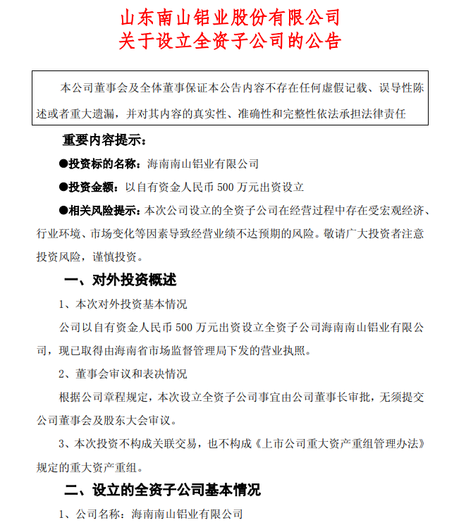 公司形成海南南山铝业有限公司,经营范围为一般经营项目:金属材料销售;金属矿石销售;以自有资金从事投资活动;货物进出口(经营范围中的一般经营项目依法自主开展经营活动,通过国家企业信用信息公示系统(海南)向社会公示)。 提及设立该全资子公司的目的,南山铝业表示,本次投资设立全资子公司依托海南自贸港政策与区位优势,完善公司区域产业布局,拓展高端铝制品研发、货物进出口贸易等业务场景,以子公司为区域支点拓宽海外市场辐射范围,拓展发展空间,增强整体经营韧性与长期可持续发展能力;同时通过设立全资子公司,实现区域化经营管理,提升对海内外市场的响应速度,优化整体业务结构与资源配置效率。 且本次投资设立全资子公司符合公司战略规划及经营发展的需要,对公司的长远发展和企业效益将产生积极影响,本次投资设立全资子公司是以自有资金投入,不会对公司财务状况及生产经营造成重大不利影响,不存在损害公司及全体股东利益的情形。 与此同时,公司还对此次投资设立全资子公司的风险作出分析,其表示,经营过程中存在受宏观经济、行业环境、市场变化等因素导致经营业绩不达预期的风险。敬请广大投资者注意投资风险,谨慎投资。公司将按照相关规定,及时履行信息披露义务。 公开资料显示,南山铝业已形成从热电、氧化铝、电解铝、熔铸、铝型材/热轧-冷轧-箔轧、废铝回收(再生利用)的完整铝加工产业链,主要产品包括上游产品电力、氧化铝、铝合金锭,下游产品涵盖铝板带(汽车板、航空板、罐料)、铝型材(工业型材、建筑型材)、铝箔等多个产品类型,终端产品广泛应用于若干领域,其中铝板带产品主要用于加工航空板、汽车板、罐体罐盖料等,工业型材产品主要应用于集装箱、光伏产品、新能源车用铝材、轨道交通等,建筑型材产品主要应用于铝合金门窗、幕墙等,铝箔产品主要应用于动力电池箔、食品软包装、香烟包装、医药包装、空调箔等。 南山铝业此前三季度业绩报告显示,公司第三季度共实现90.51亿元的营收,同比增长5.75%;归属于上市公司股东的净利润为11.47亿元。同比下滑11.85%;前三季度公司共实现263.25亿元的营收,同比增长8.66%;前三季度归属于上市公司股东的净利润总计37.72亿元,同比增长8.09%。其中三季度公司印尼氧化铝营业收入较上年同期大幅增加。