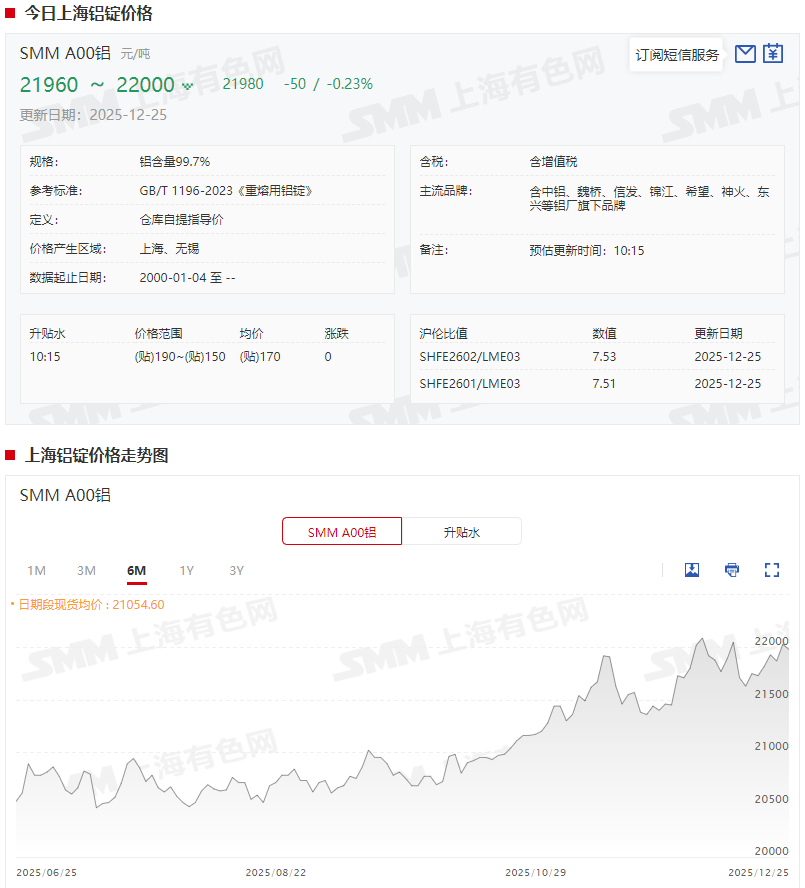 而近期,铝价整体维持高位震荡的态势,宏观面上,海内外宏观情绪偏向利好,市场对美联储降息预期增强,利多铝价及有色金属板块。基本面来看,国内铝市场基本面目前难以对铝价持续上涨形成有力支撑,终端需求偏弱,铝水比例随之下降。综合来看,尽管基本面驱动力有限,但国内外宏观面表现依旧乐观,铝价高位震荡运行格局不改。 截至12月25日,SMM A00铝现货报价维持在21960~22000元/吨,均价报21980元/吨。