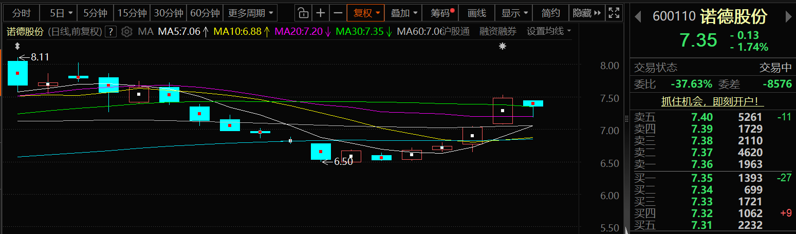 12月25日,诺德股份股价出现下跌,截至25日14:08分,诺德股份跌1.74%,报7.35元/股。
