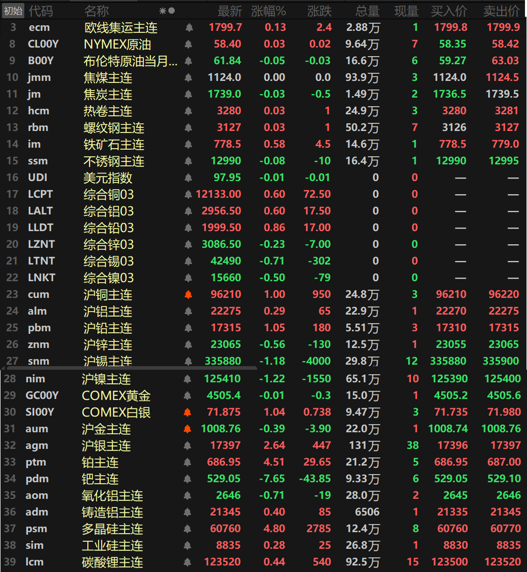 SMM 12月25日讯: 金属市场: 截至日间收盘,内盘基本金属涨跌互现,沪铜涨1%,沪铅涨1.05%,沪铝涨0.29%,其余金属均下跌,沪锡、沪镍一同跌超1%,沪锡跌1.18%,沪镍跌1.22%。氧化铝跌0.71%,铸造铝涨0.4%。 此外,碳酸锂主连涨0.44%,多晶硅主连涨4.8%,工业硅主连涨0.28%。欧线集运主连涨0.13%报1799.7。 黑色系方面涨跌互现,不锈钢跌0.08%,铁矿涨0.58%。螺纹、热卷一同涨0.03%。双焦方面,焦煤暂时持平于1124元/吨,焦炭跌0.03%。 外盘基本金属方面,LME金属因圣诞节假期休市。 贵金属方面,COMEX黄金和COMEX白银因圣诞节假期休市。内盘贵金属方面:沪金跌0.39%,沪银涨2.64%。 此外,铂主连涨4.51%,盘中最高冲至700.9元/克,继续刷新其上市以来历史新高,钯主连跌7.65%,早些时候一度跌停,临近收盘跌幅有所收窄。 截至今日15:04分行情