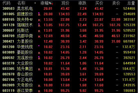 25日,A股三大股指午后集体拉升,沪指7连阳;北证50指数一度涨超1%,市场整体活跃,全A股市场近3800股飘红,近百股涨停。 具体来看,沪指盘中震荡上扬,午后再度攀升,创业板指等均走高。截至收盘,沪指涨0.47%报3959.62点,深证成指涨0.33%,创业板指涨0.3%,北证50指数涨0.86%,沪深北三市合计成交19440亿元,较此前一日增加467亿元。 保险板块拉升,中国太保创历史新高,中国平安创逾4年新高;酒类股迎来久违的反弹,水井坊(600779)午后直线拉升涨停;军工板块强势,商业航天概念热度不减,神剑股份斩获6连板;中国卫星连续两日涨停;人形机器人概念崛起,昊志机电、超捷股份双双涨停创出新高。值得注意的是,多只强势股继续封板,胜通能源(001331)、嘉美包装(002969)分别斩获10连板和7连板。 机器人概念爆发 人形机器人概念盘中强势拉升,截至收盘,昊志机电、超捷股份20%涨停,均创出新高;埃夫特、强瑞技术、拓斯达涨超13%,瑞可达涨近10%。