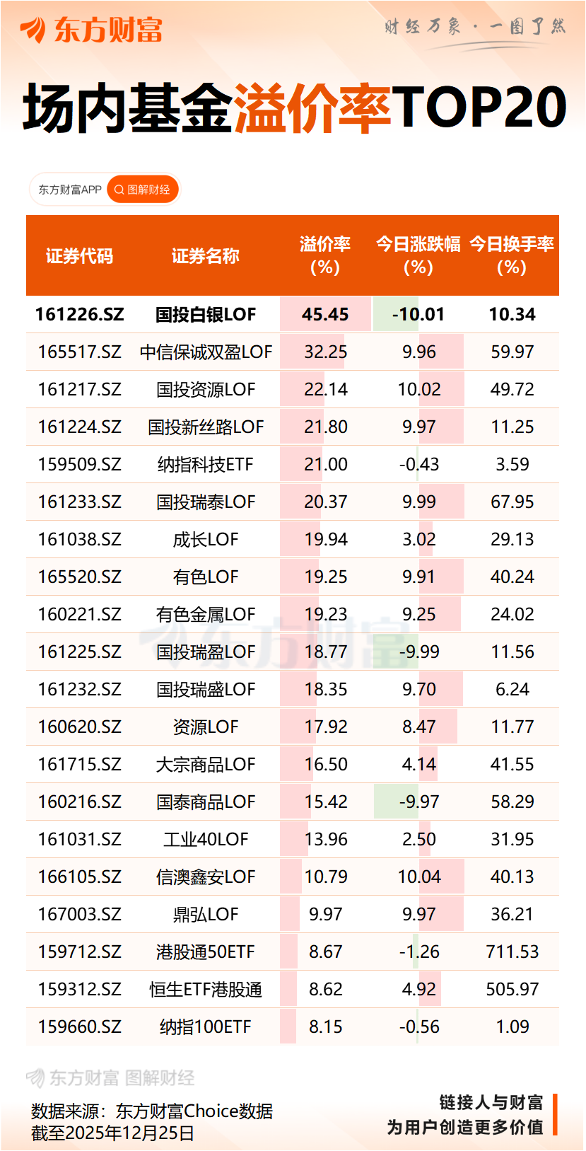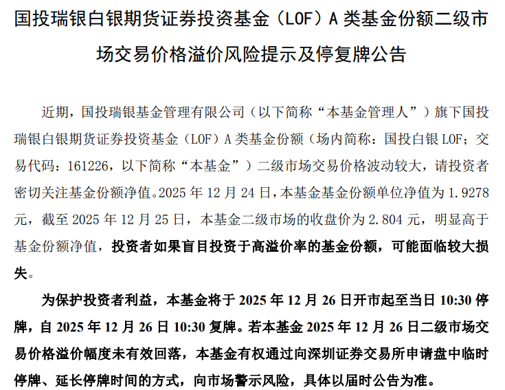 12月25日,国投白银LOF公告,截至2025年12月25日,本基金二级市场的收盘价为2.804元,明显高于基金份额净值,投资者如果盲目投资于高溢价率的基金份额,可能面临较大损失。为保护投资者利益,本基金将于2025年12月26日开市起至当日10:30停牌,自2025年12月26日10:30复牌。