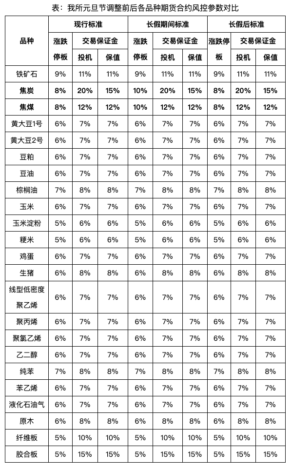 12月25日,大连商品交易所发布通知,根据《大连商品交易所风险管理办法》,经研究决定,该所将在2026年元旦节休市前后对各品种期货合约涨跌停板幅度和交易保证金水平做如下调整: 自2025年12月30日(星期二)结算时起,焦炭品种期货合约涨跌停板幅度调整为10%,交易保证金水平维持不变;焦煤品种期货合约涨跌停板幅度调整为10%,交易保证金水平维持不变;其他品种期货合约涨跌停板幅度和交易保证金水平维持不变。 2026年1月5日(星期一)恢复交易后,在各品种持仓量最大的合约未出现涨跌停板单边无连续报价的第一个交易日结算时起,做如下调整: 焦炭、焦煤品种期货合约涨跌停板幅度恢复至节前标准。其他品种期货合约涨跌停板幅度和交易保证金水平维持不变。 ![]() 对同时满足《大连商品交易所风险管理办法》有关调整涨跌停板幅度和交易保证金规定的合约,其涨跌停板幅度和交易保证金按照规定数值中较大值执行。 (文章来源:界面新闻) |