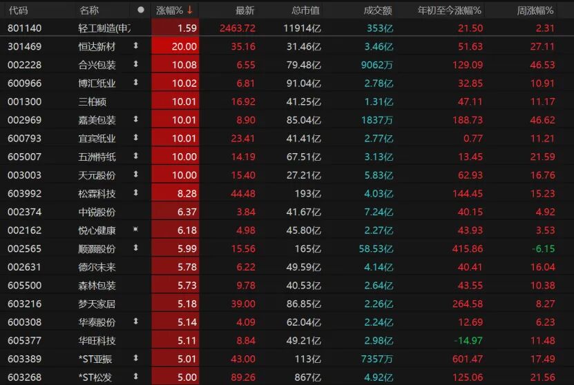 10只轻工制造个股涨停,恒达新材“20cm”涨停,合兴包装、博汇纸业、三柏硕、嘉美包装、宜宾纸业、五洲特纸、天元股份均涨停。