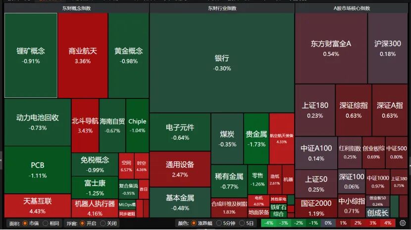 盘面上,商业航天、北斗导航、航空航天设备、通用设备、机器人、天基互联、机器人执行器大涨。黄金概念、锂矿概念、PCB、免税概念、银行、电子元件、海南自贸、零售均收跌。