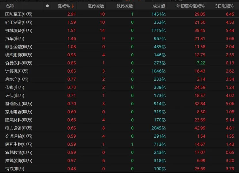 31个申万一级板块中,综合、有色金属、商贸零售、煤炭、银行、通信微跌,其余收红。国防军工、轻工制造、机械设备、汽车、非银金融板块涨幅均超过1%。