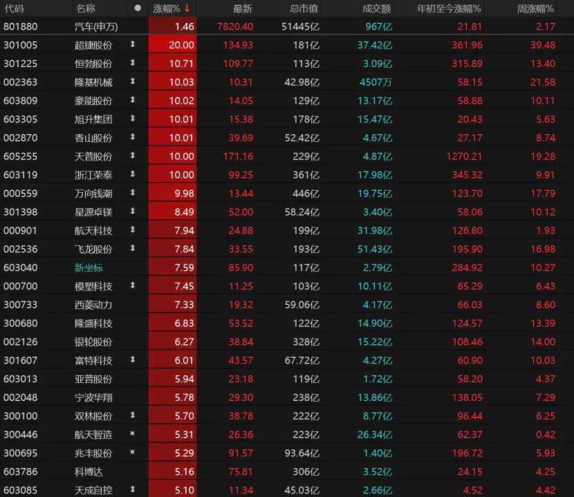 9只汽车股涨停,超捷股份“20cm”涨停,隆基机械、豪能股份、旭升集团、香山股份、天普股份均涨停。